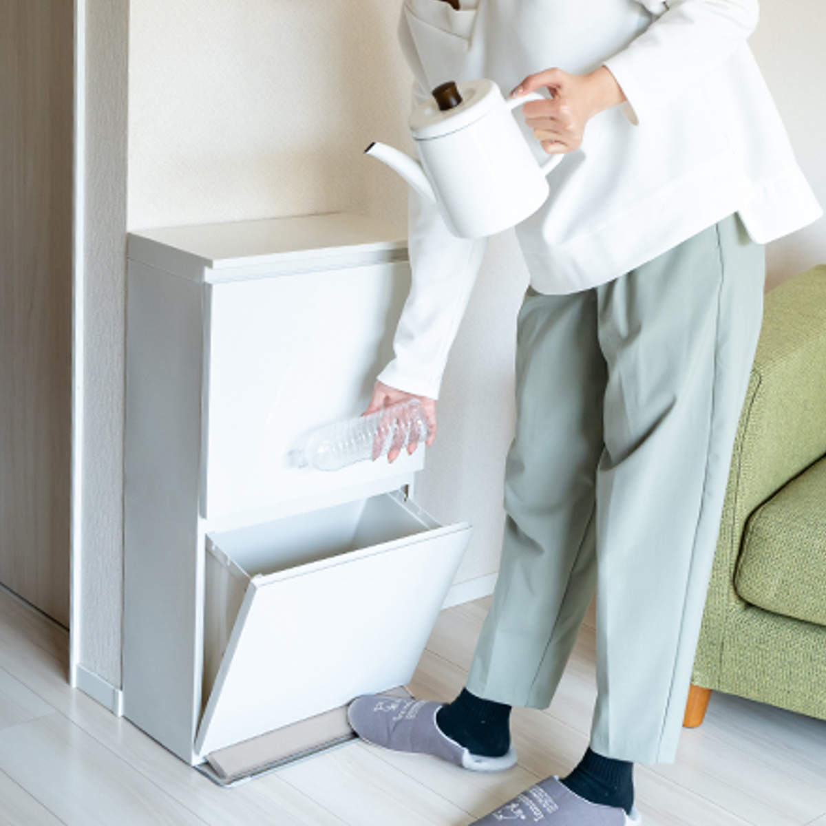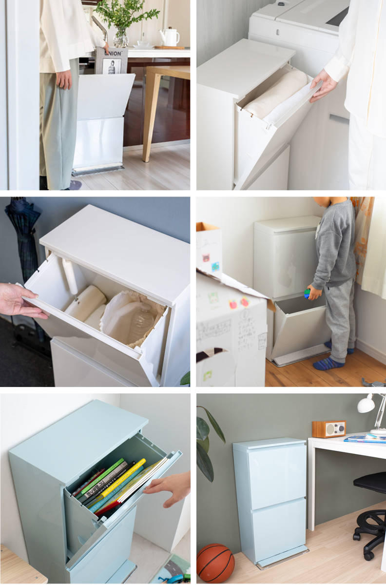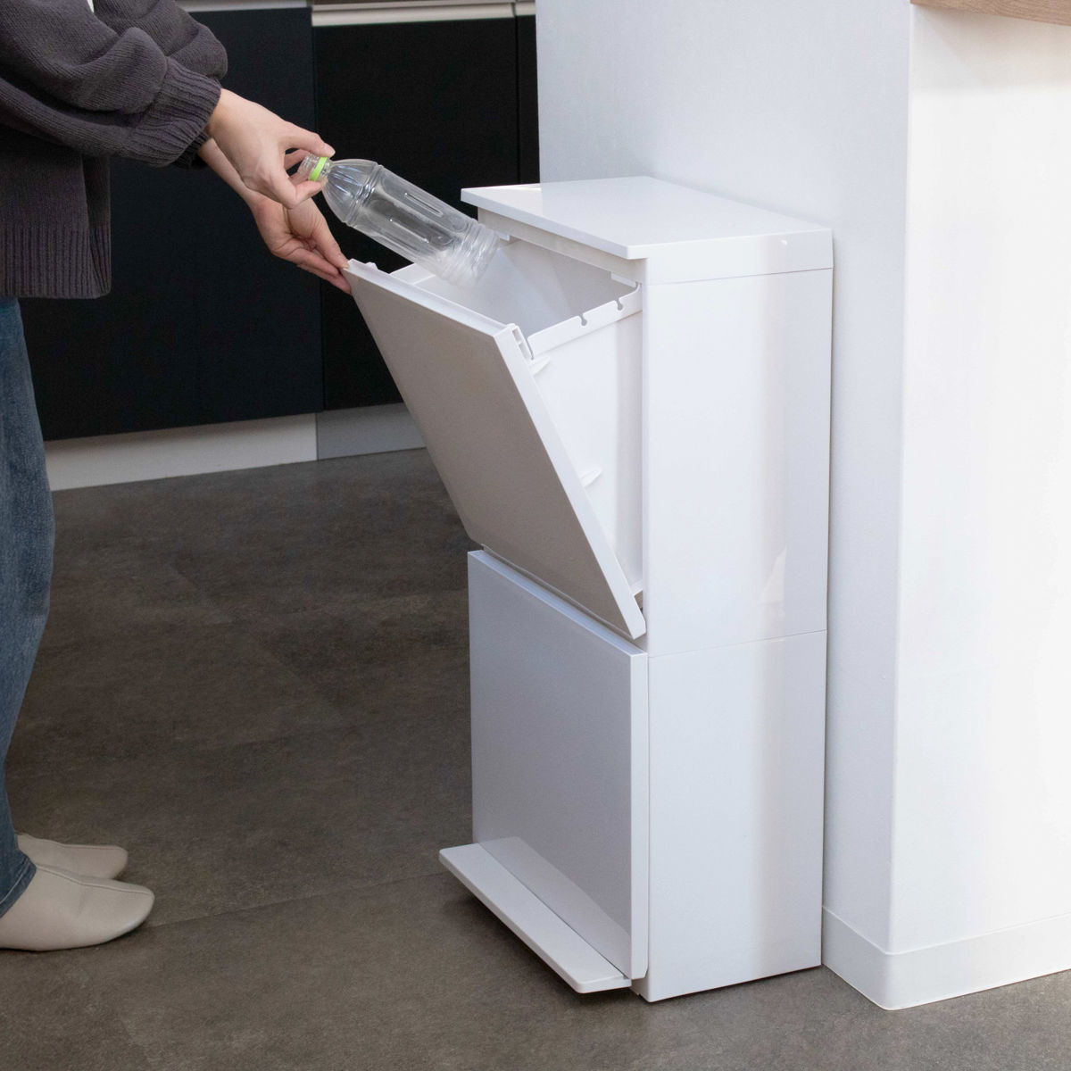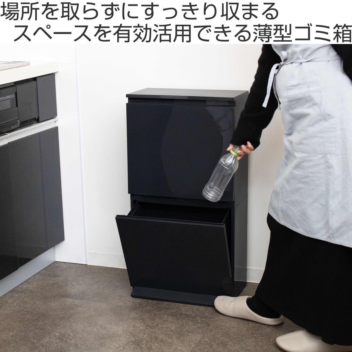 省スペースでもしっかり分別スリムな見た目ながら、上下2段の分別仕様。上段は手前に引いて大きく開くため、お菓子の空き箱やペットボトルなどのかさばるゴミや生ゴミもスムーズに捨てられます。