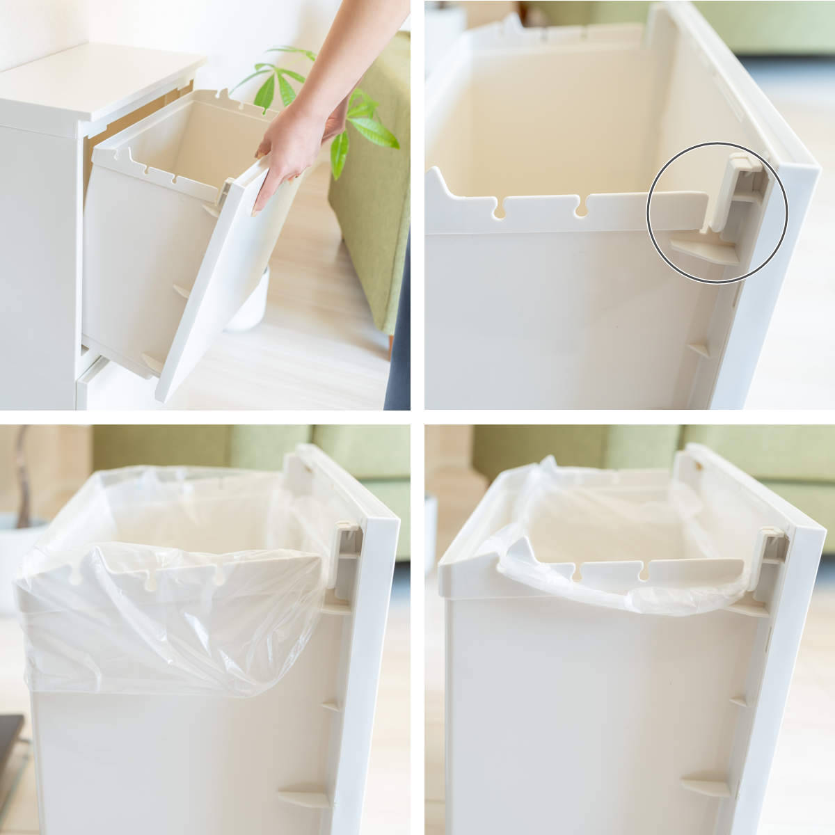 (3)ポリ袋は容器全体に被せるようにセット。持ち手付きポリ袋は袋に合った丸い溝に引っ掛けてセット。