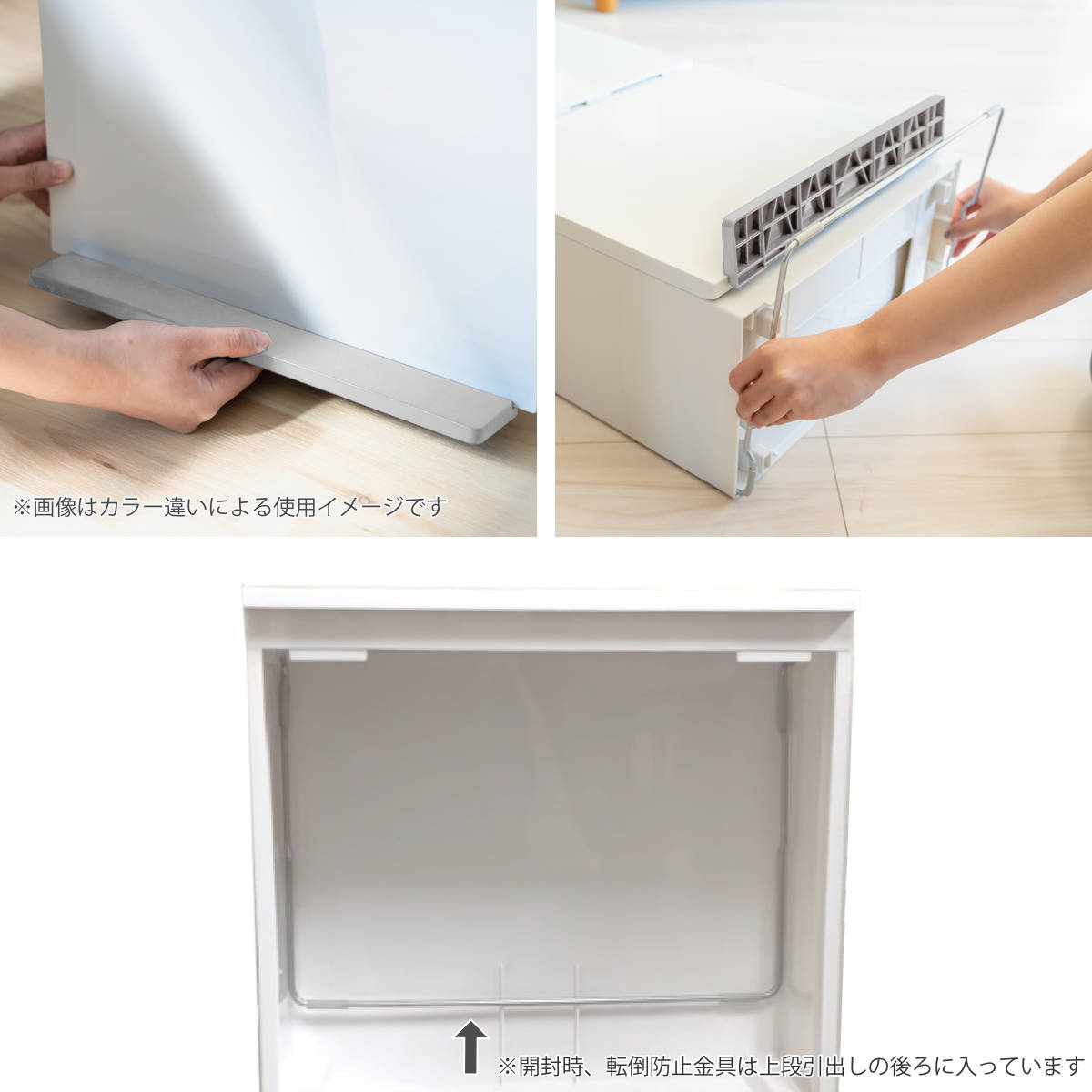 ※転倒防止金具は、ゴミ箱本体の上段に固定した状態でお届けします。ご使用前にご確認ください。