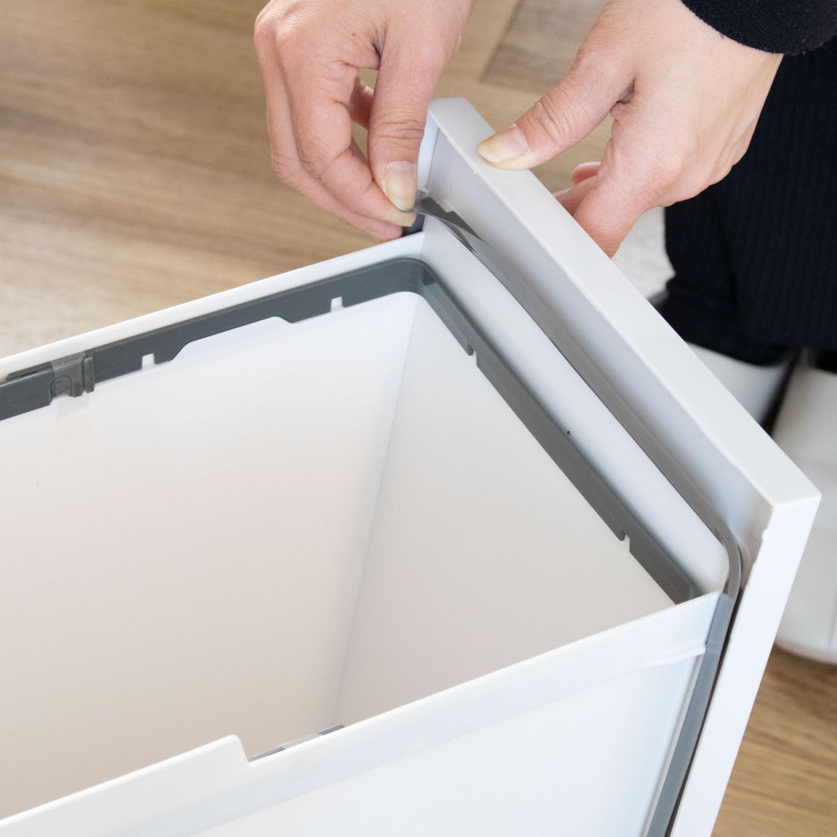 ゴミ袋は見せずにすっきり本体に付属の袋止めフレームを使って、ゴミ袋をしっかり固定できます。袋の端を内側に入れ込むだけなので簡単、袋がはみ出さず生活感をオフできます。
