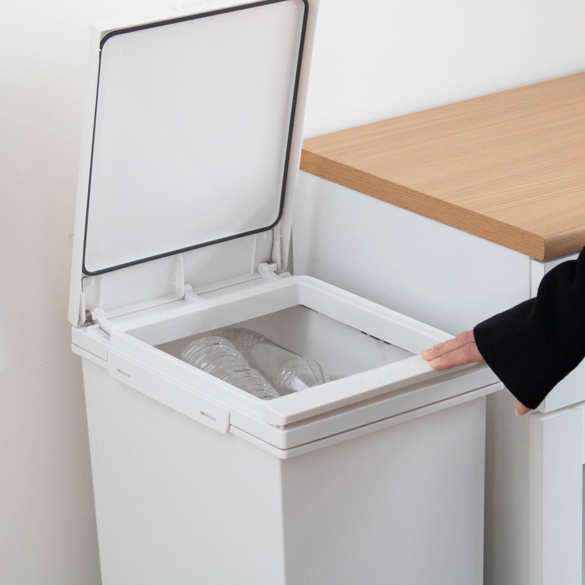 上段はワンタッチ開閉でラクラク上段は指1本で押して開くプッシュ式フタです。開けっ放しにもできるので、調理中の野菜くず捨てなどもスムーズです。