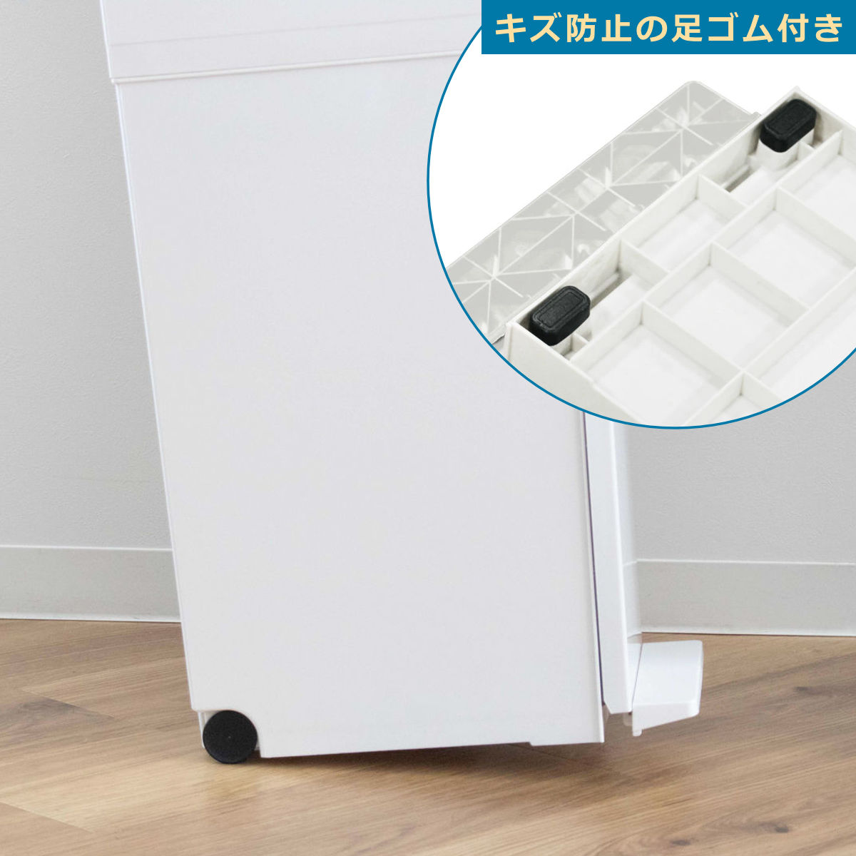キャスター付きで移動も簡単背面のキャスターで、掃除やゴミ袋交換の際もスムーズに移動。底面の前側には足ゴム付きなので、床を傷つけにくく安心して設置できます。