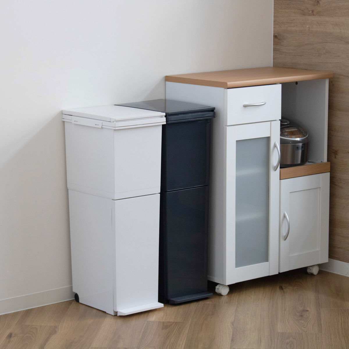 2個並べて分別上手なキッチンに生ゴミと資源ごみを縦型2段でスマートに分別。スリムな幅だから2個並べてもすっきり収まり、缶・ペットボトル・プラごみなど細かな分別にも対応できます。