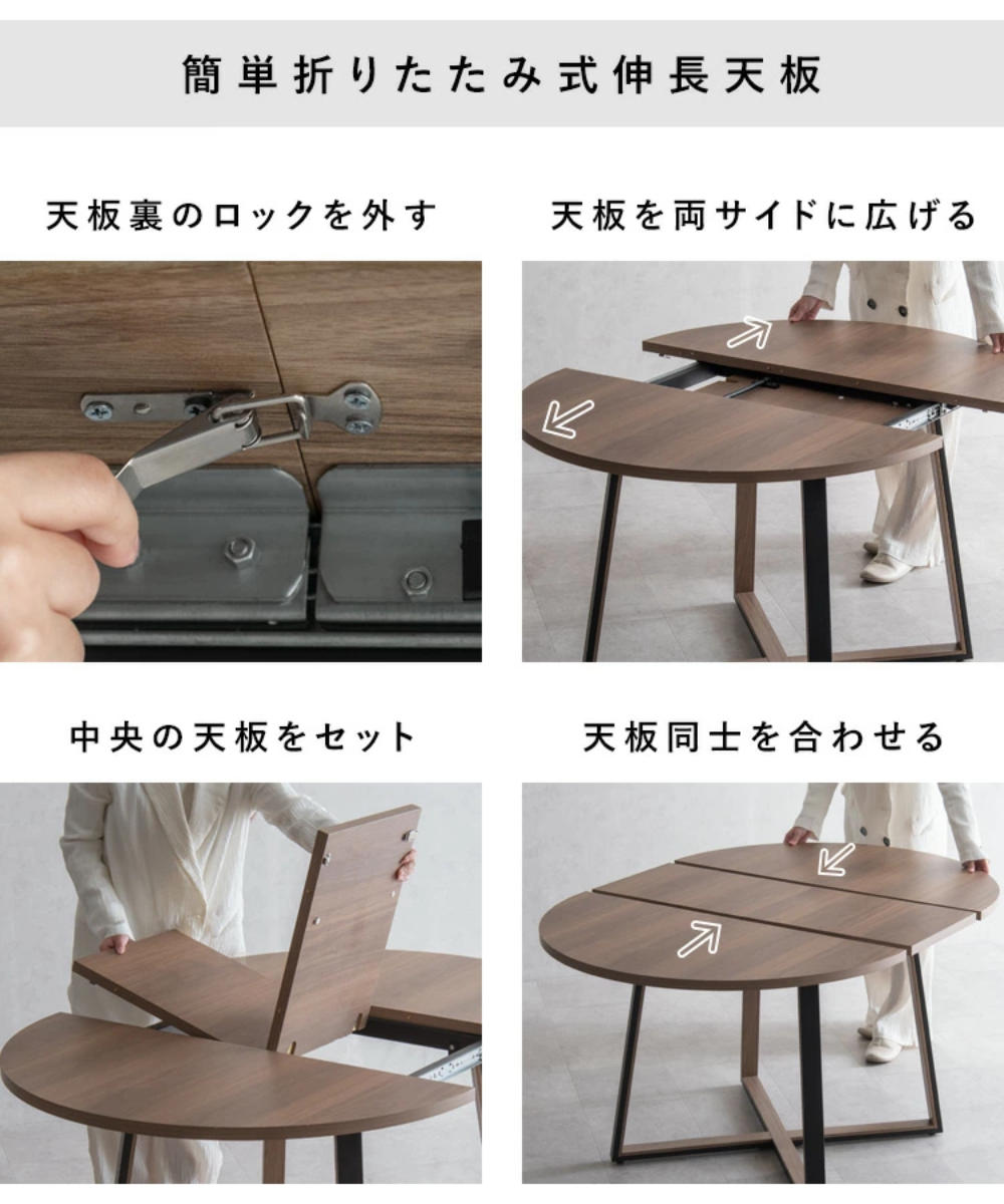 天板下に収納された折りたたみ式天板を広げてセットするだけで、ラクにサイズ変更できます。