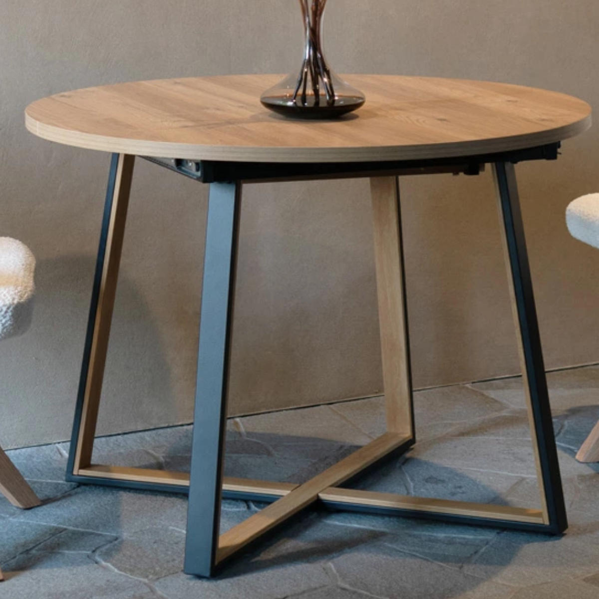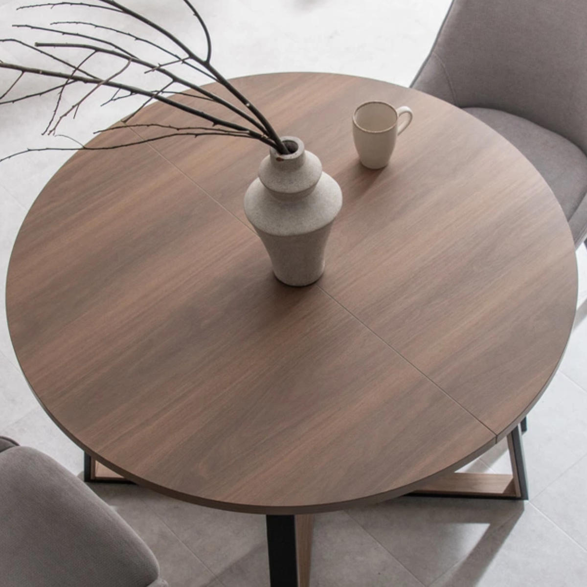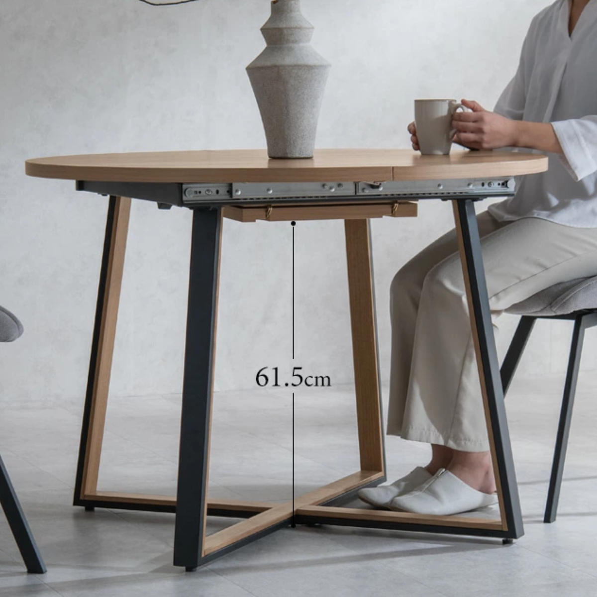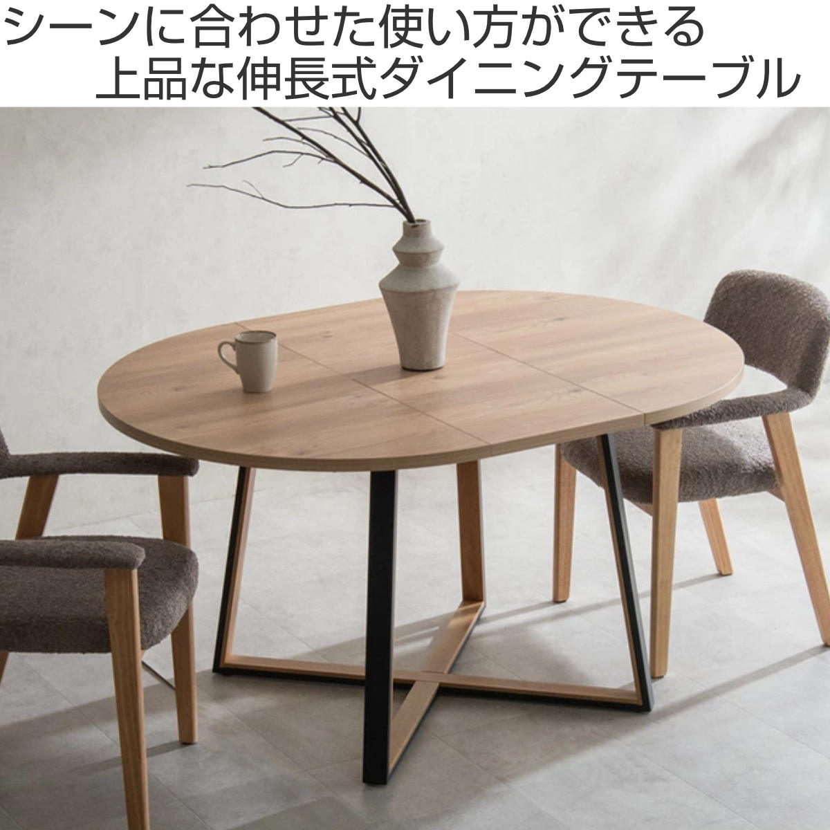 伸長しても丸みのあるデザインで、北欧風・ナチュラルテイストのダイニングにも自然に馴染みます。
