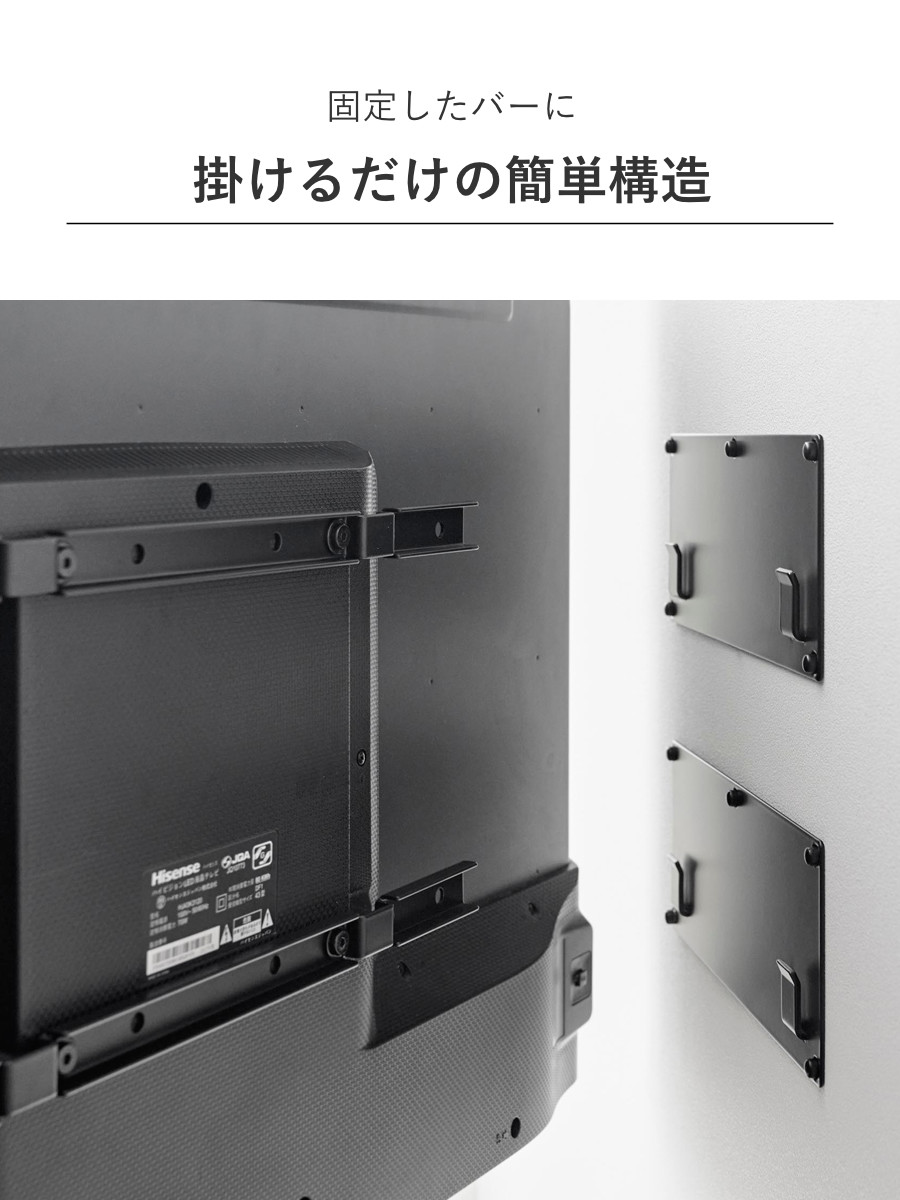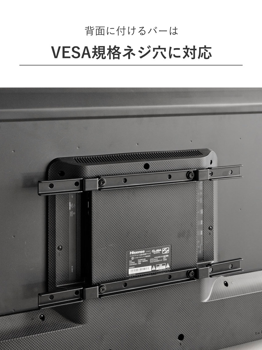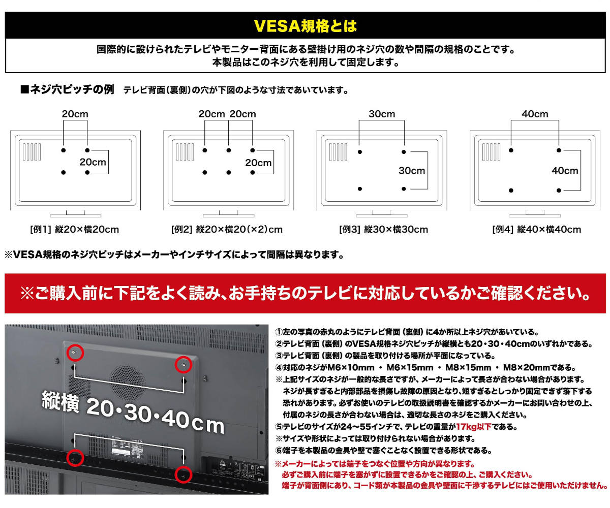 | 対応サイズ | 取り付け可能なテレビ(VESA規格対応) サイズ:24〜55インチ 重量:17kg以下 VESA規格ネジ穴ピッチ:縦横 20/30/40cm 背面が平らなテレビ ※テレビの形状や、ネジ穴の間隔など仕様によっては取り付けられない場合があります。 |