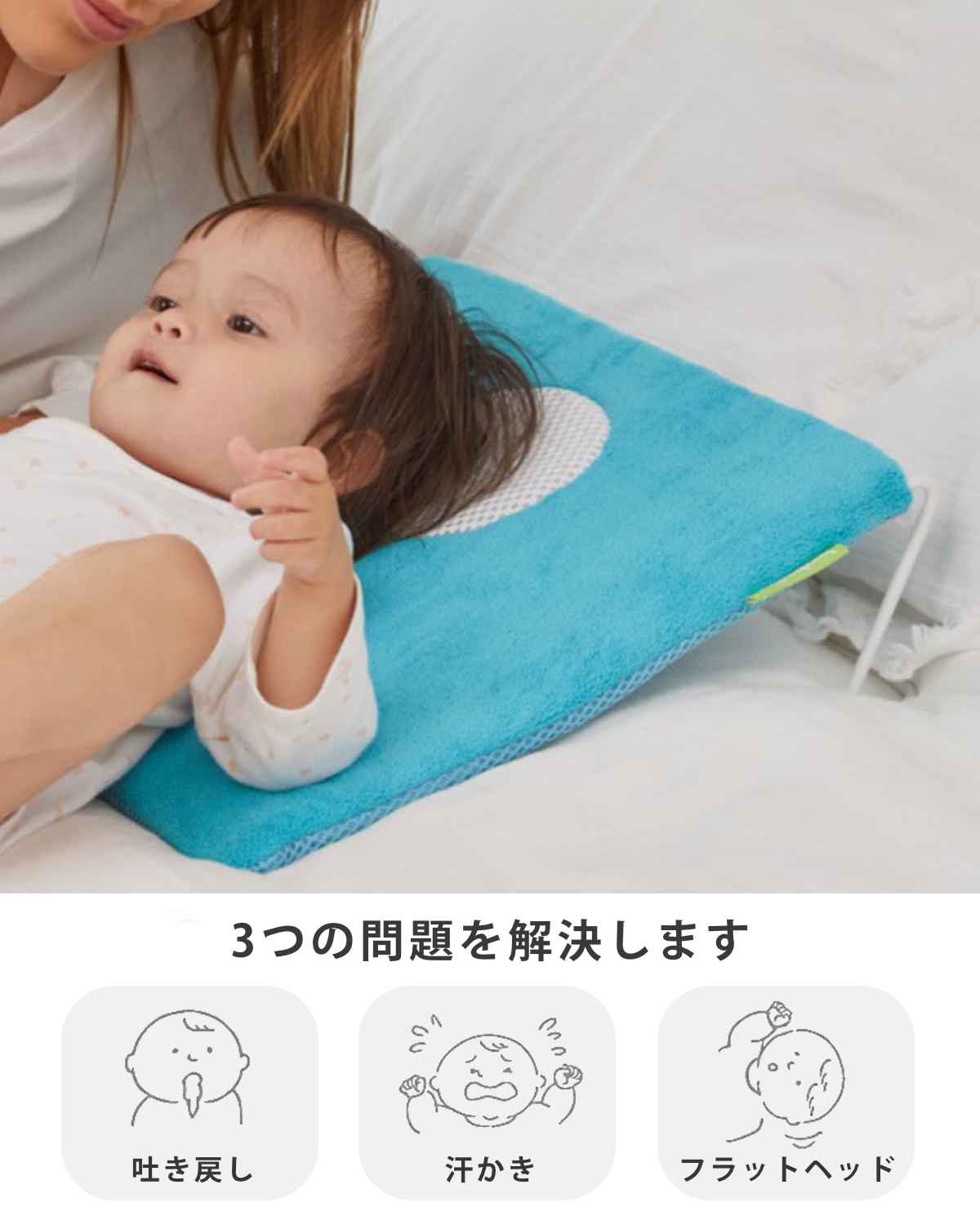 | 正しい姿勢で眠れる 赤ちゃんの頭の高さに最適な角度がついているので、正しい姿勢で寝ることができます。 | うつ伏せになっても安心 万が一枕にうつ伏せになってしまっても、優れた通気性により窒息を防止します。 |