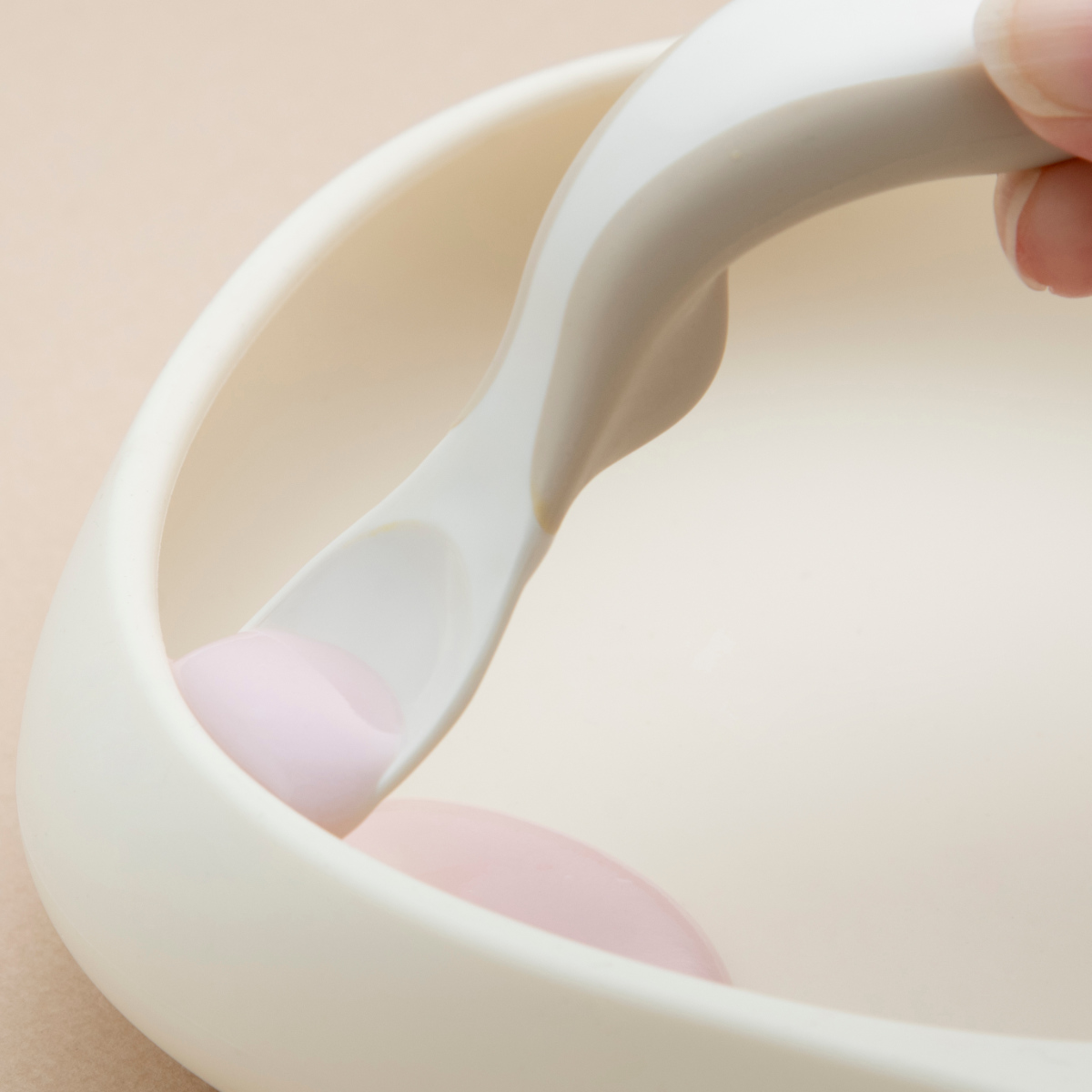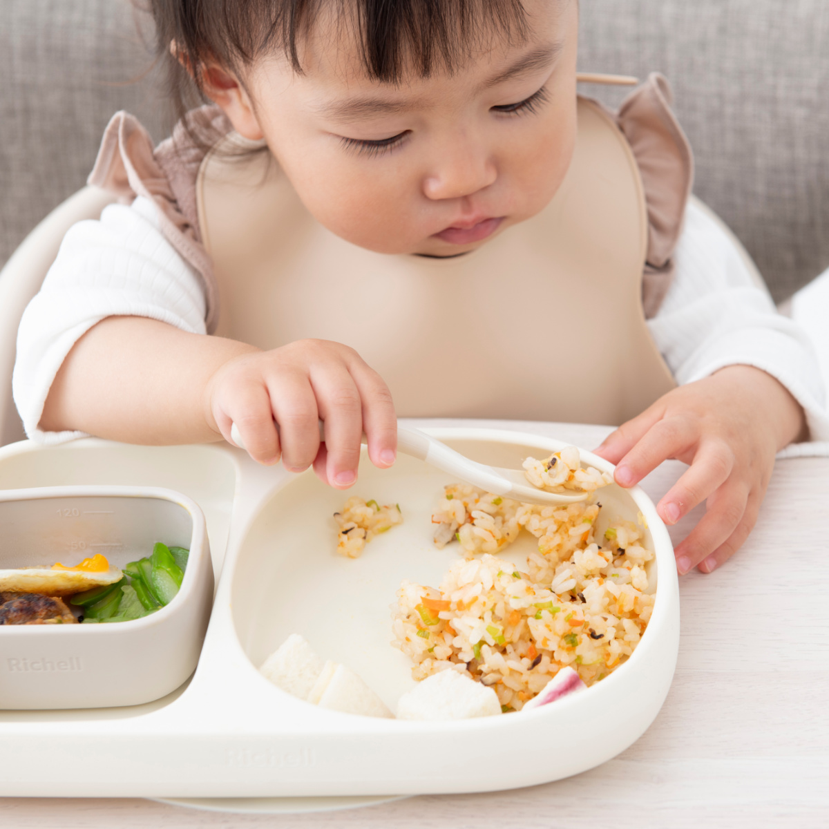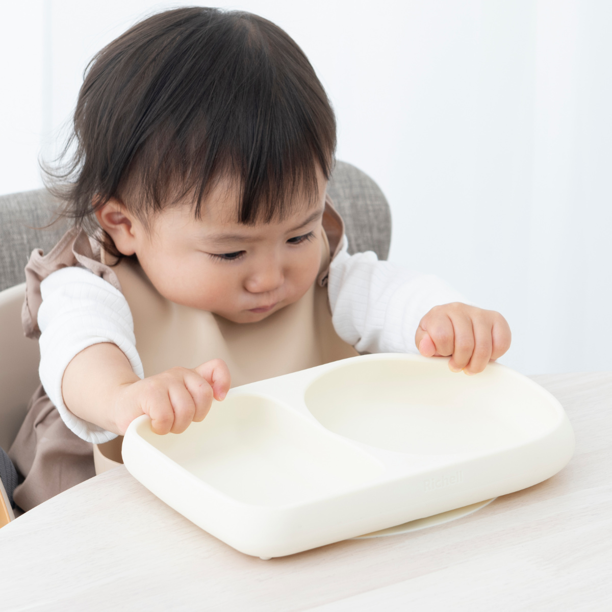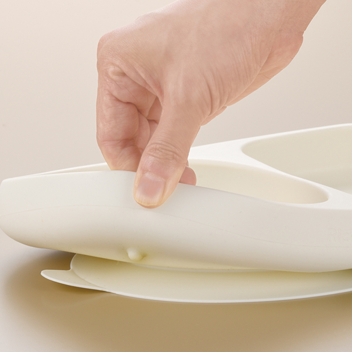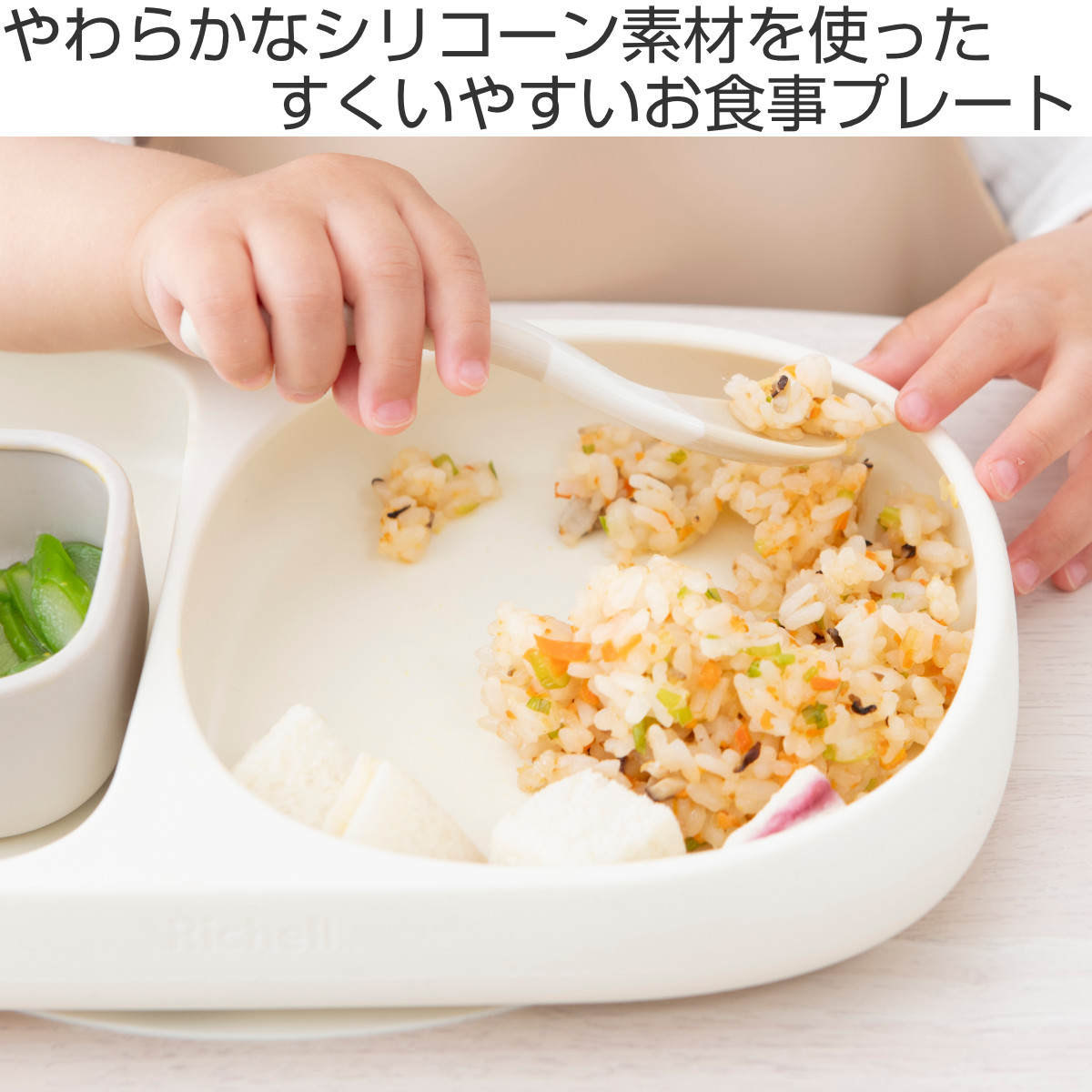 ●赤ちゃんの食べる動きを考えて作られた、すくいやすさにこだわったシリコーンプレートです。