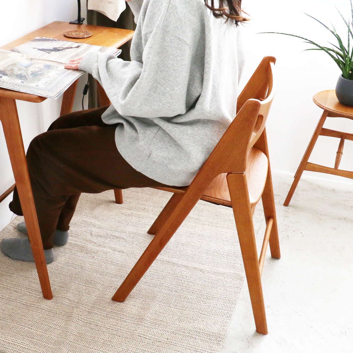 フレームの直線と背もたれのなめらかなカーブを組み合わせた、美しいバランスのデザインです。天然木ならではの質感が空間にやさしいぬくもりを与えます。