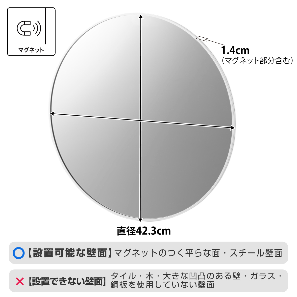 | 材質 | フレーム:ABS樹脂 マグネット・滑り止め:シリコーンゴム ミラー:ポリスチレン 表面フィルム:PET |