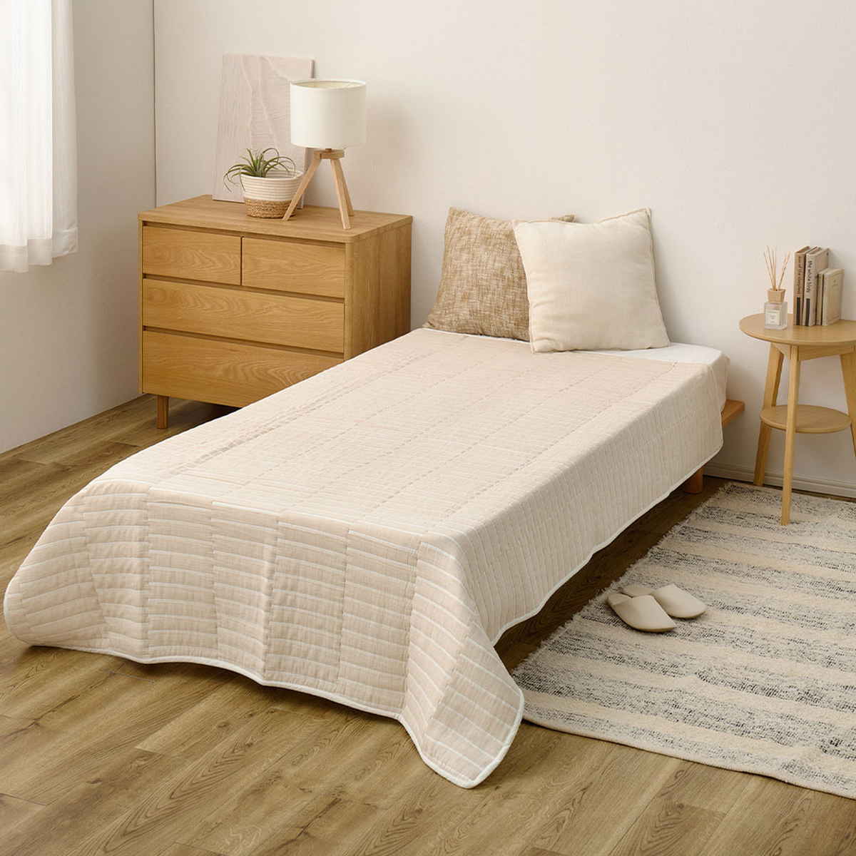 通気性とほどよい保温性を兼ね備えたコットン素材を使用しており、春夏はさらっと涼しく、秋冬はやさしいぬくもりを感じられます。寝室だけでなく、リビングでのくつろぎ時間にも活躍します。
