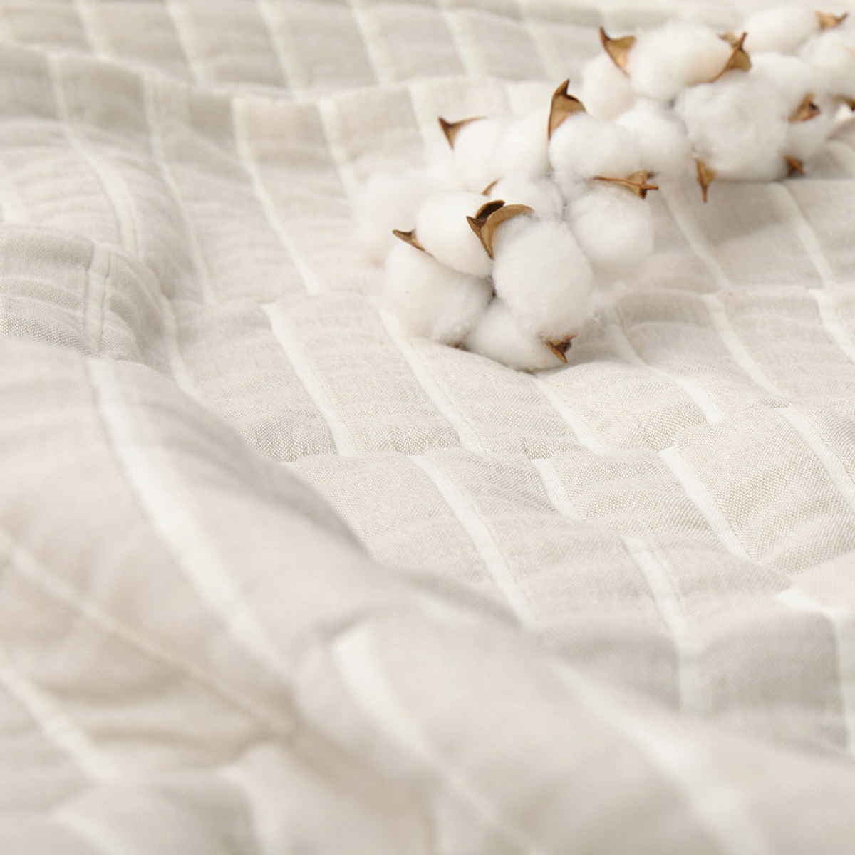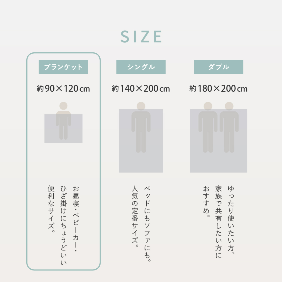 約90×120cmの扱いやすいサイズで、お昼寝用やベビーカーでの使用、ひざ掛けなど様々なシーンで活躍します。毎日の暮らしの中で気軽にお使いいただけます。