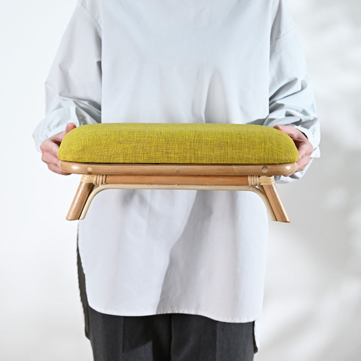 座椅子の重量はわすか約1kgです。片手でも持ち運びができてしまうほどの軽量なので、ヨガや座禅、お子様の椅子、オットマン使いにと、色々な使い方ができます。使用シーンに合わせて簡単に持ち運べるのは嬉しいポイントです。
