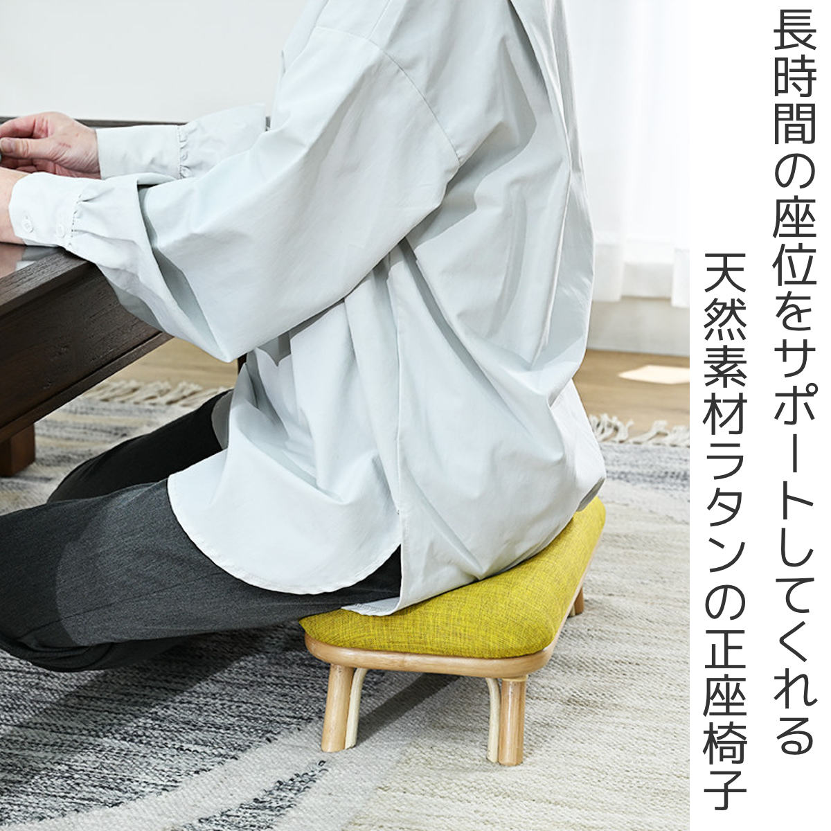 脚を曲げたり伸ばしたり、あぐらを組んだりと、さまざまな座り方ができる正座椅子です。長時間、座っていないといけない時でも無理のない姿勢をサポートしてくれます。和室にも洋室にもなじみやすい、ナチュラルカラーとシンプルなデザインです。天然素材ラタンのあたたかみのある風合いが、お部屋に自然と調和します。