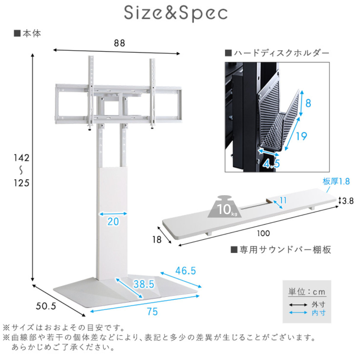 | サイズ | 【テレビスタンド】 約 幅88×奥行50.5×高さ125〜142(cm)まで伸縮可能 【サウンドバー】 約 幅100×奥行18×高さ3.8(cm) |
