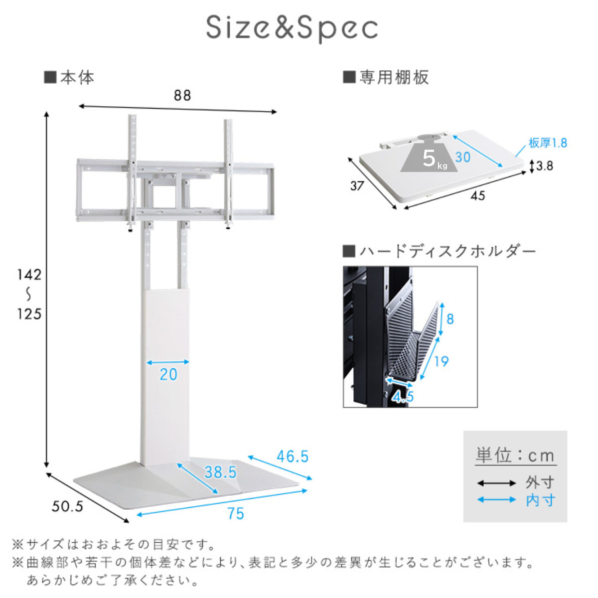 | サイズ | 【テレビスタンド】 約 幅88×奥行50.5×高さ125〜142(cm)まで伸縮可能 【棚板】 約 幅45×奥行37×高さ3.8(cm) |