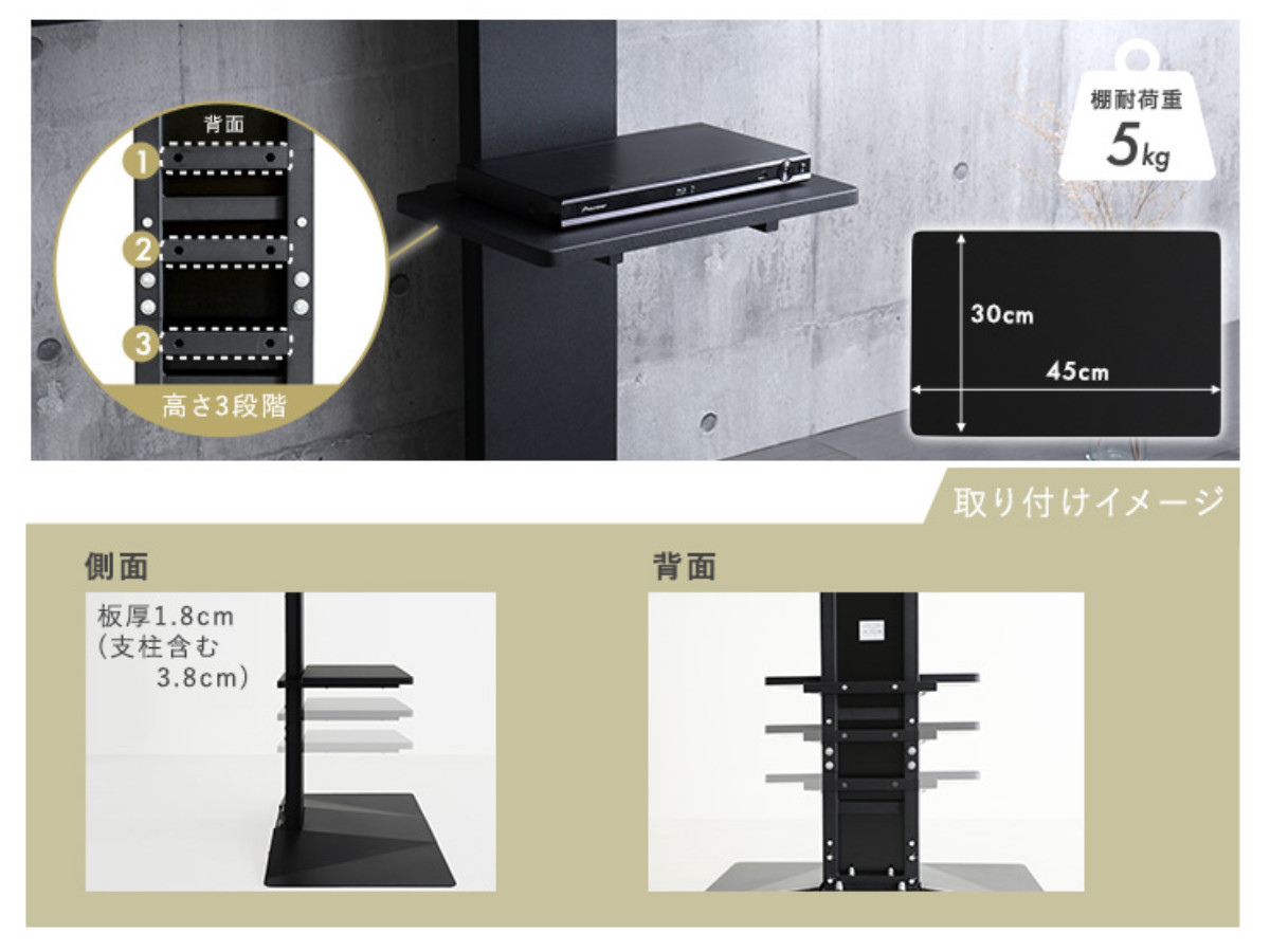 テレビ周辺の機器をすっきり収納・整理耐荷重は約5kgで安定感があり、ブルーレイレコーダー、ゲーム機、ルーター、リモコンなど、 テレビ周辺の機器をまとめて置けるスペースを確保できます。