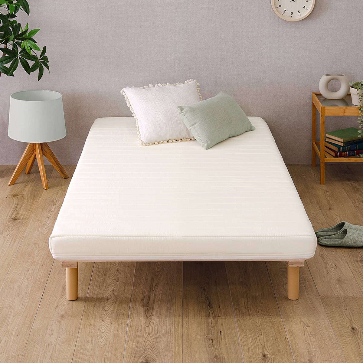 継ぎ目のない、一体型の脚付きマットレスです。良質なマットレスと通気性の良いすのこベッドを一体化した、シンプルに暮らしたい人にぴったりなミニマルデザインです。フレームがないシンプルな構造なので、場所を取らずに設置できます。