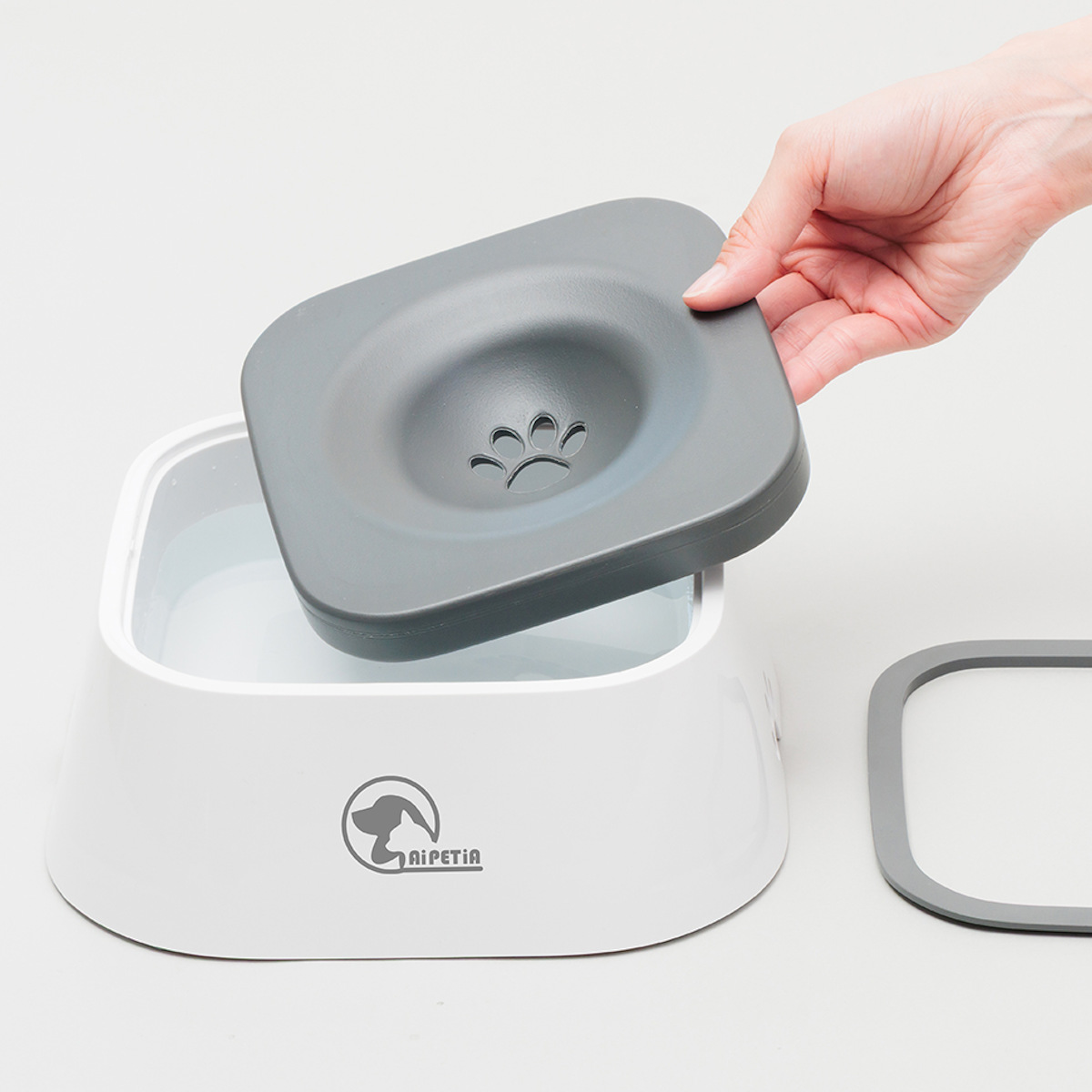 水が飛び散りにくい「浮きフタ設計」フローティングディスクの中央の凹んだ部分に水が溜まり、水を飲むときに水が飛び散りにくい設計です。ペットが舌でフローティングディスクを押すことで、水が少しずつ出てくる仕組みです。ホコリやゴミが入りにくいので衛生的です。