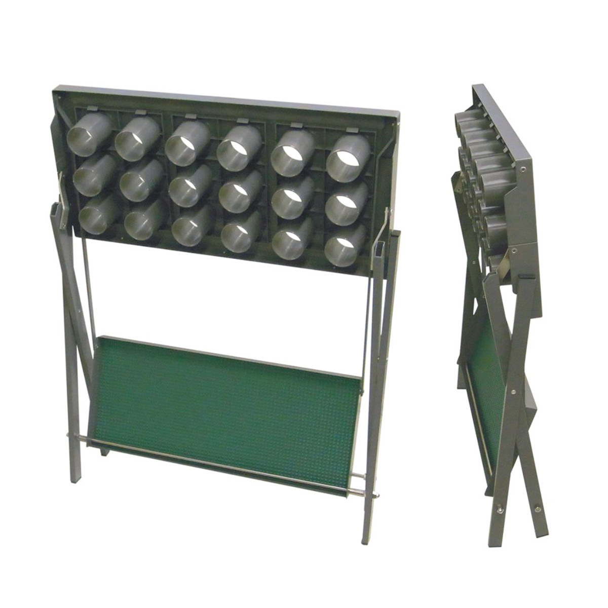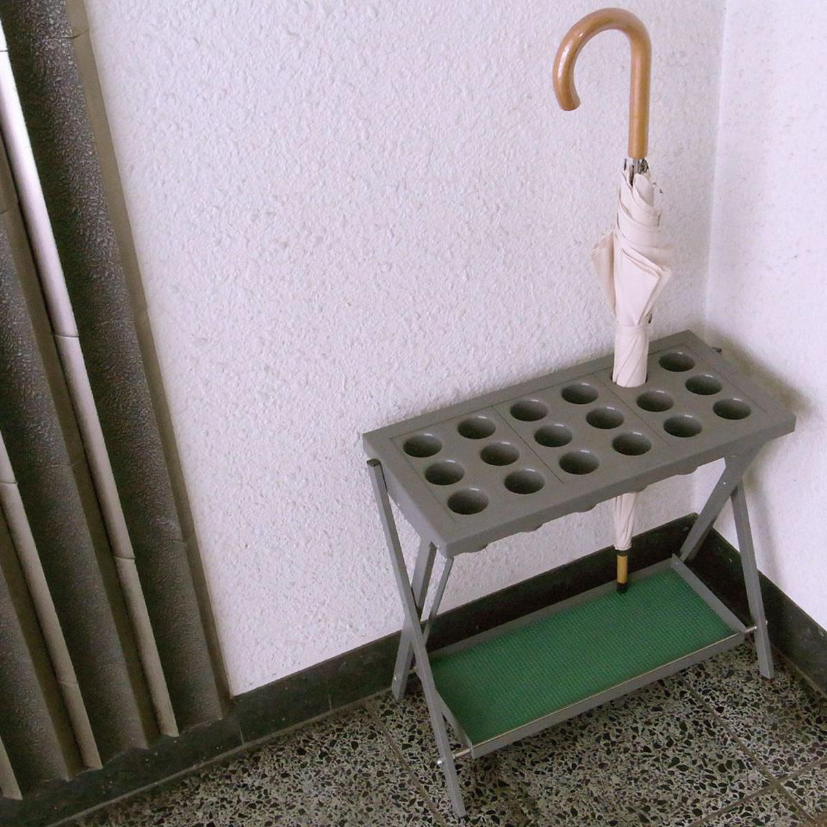 使いやすい折りたたみ式の傘立て 18本立スチールと樹脂を組み合わせた、折りたたみ式の傘立てです。傘枠には仕切り筒が付いており、傘がスムーズに出し入れできます。病院、公共施設、ホテル、小売店舗、工場、学校、オフィスなどにおすすめです。