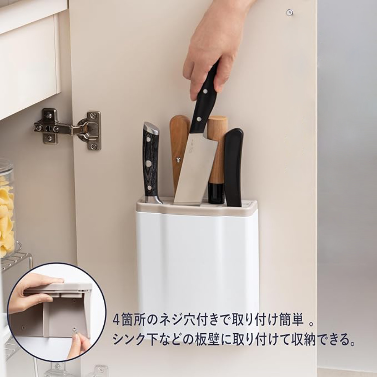 取り付け簡単4箇所のネジ穴付きで取り付けも簡単。シンク下などの板壁に設置でき、省スペースにすっきり収納できます。