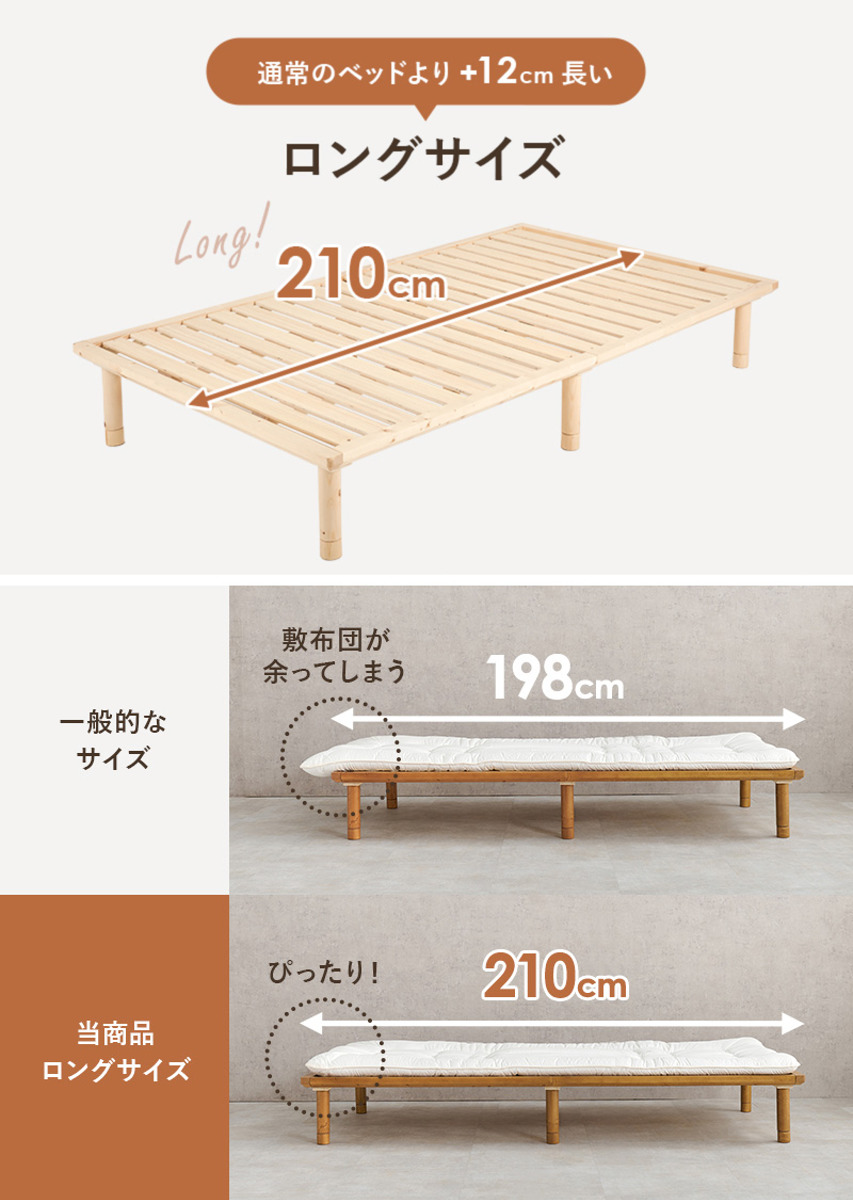 敷布団がぴったり収まるロングサイズ一般的なマットレスサイズに合わせたベッドが多い中、本製品は奥行を通常より約+12cm長く設計。敷布団もぴったり収まり、無駄なくお使いいただけます。高身長の方でも脚を伸ばして、ゆったり快適におやすみいただけます。