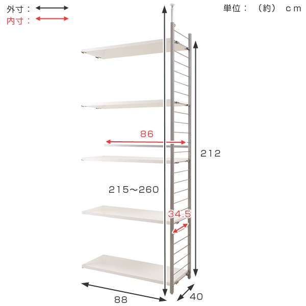| サイズ | 本体:(約)幅88×奥行40×高さ215〜260(cm) 収納部内寸:(約)幅86×奥行34.5×高さ8(cm) |