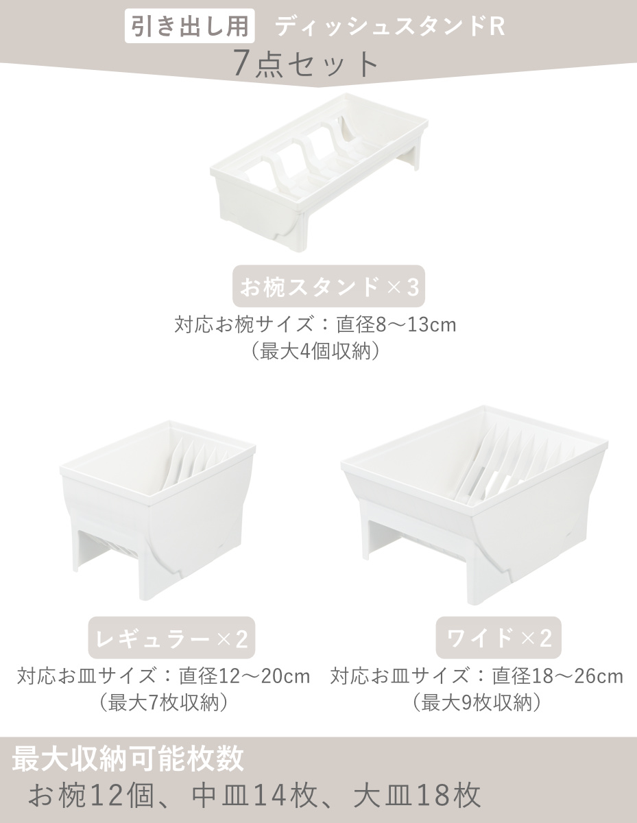 | 内容量 | ディッシュスタンドレギュラー×2 ディッシュスタンドワイド×2 お椀スタンド×3 |