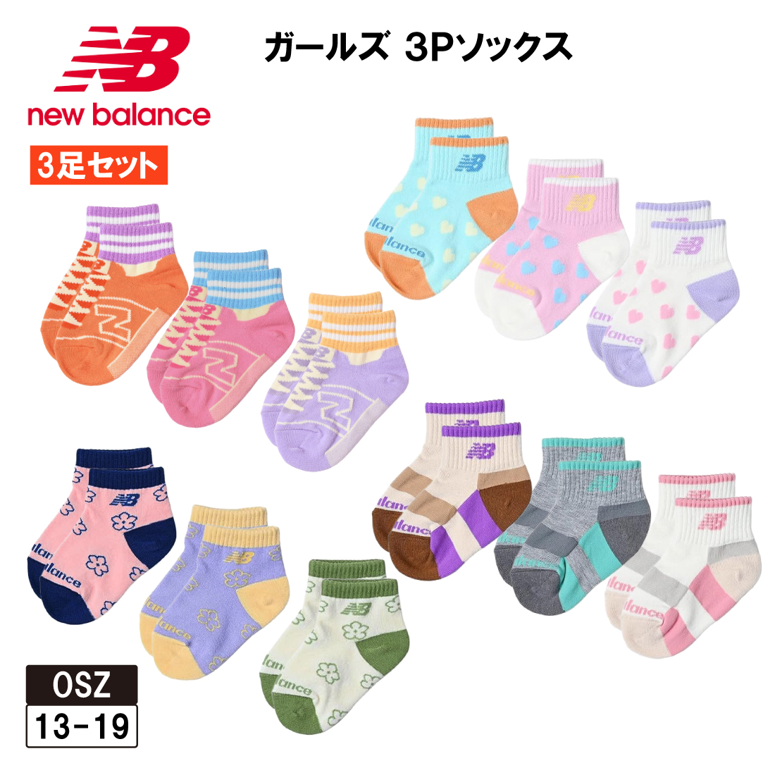 ニューバランス 靴下 ガールズ ベビー キッズ 3足セット 子供 女の子 スニーカー柄 花柄 3足組 3Pソックス 13〜19cm LAS55649 New Balance