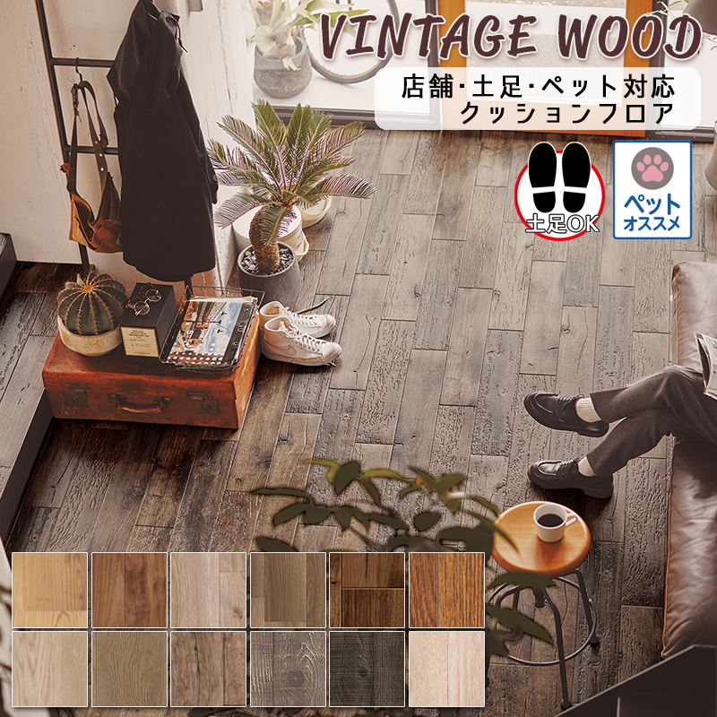 クッションフロアマット 幅182cm 長さ1m以上〜10cm単位 切り売り 土足 対応 ペット 消臭 防滑性 店舗用 ビンテージ ウッド柄 木目調 フローリング 床シート