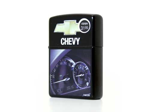 シェビーロゴとスピードメーターがプリントされたZIPPOライター。