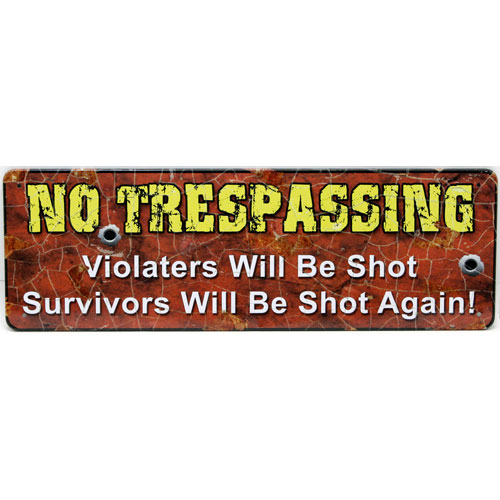 「NO TRESSPASSING, Violaters will be shot, Survivors will be shot again!」