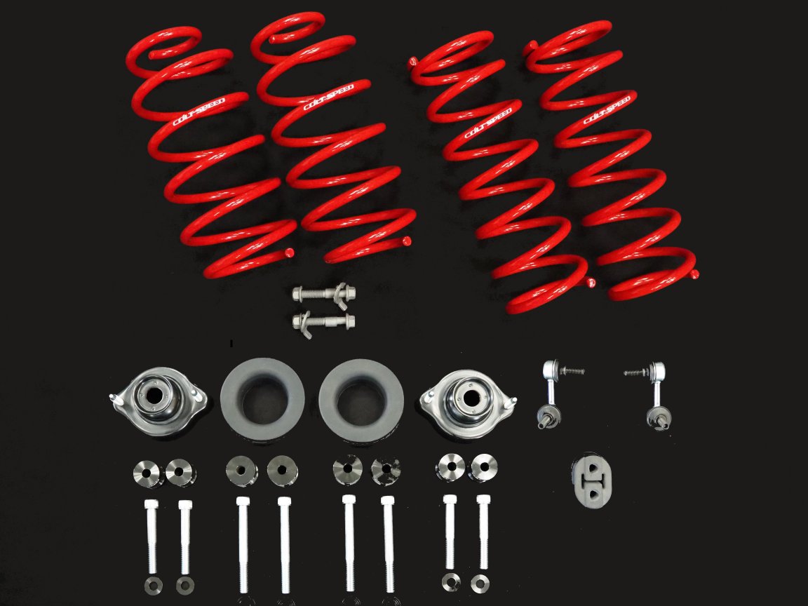 新開発のメンバースペーサーは、リフトアップによるリヤサスペンションアームのジオメトリーを補正し、フロントキャンバーボルトと合わせて4輪のホイールアライメントを適正に維持することが可能です。キットにはスペーサーと専用ボルトを始め、アッパーマウント、スプリングスペーサー、スタビリンクなど必要なパーツを全て含んだパッケージとしました。