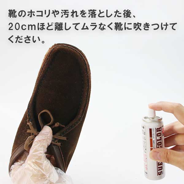 ・靴のホコリや汚れを落とした後、20cm位離してムラなく吹きつけてください。