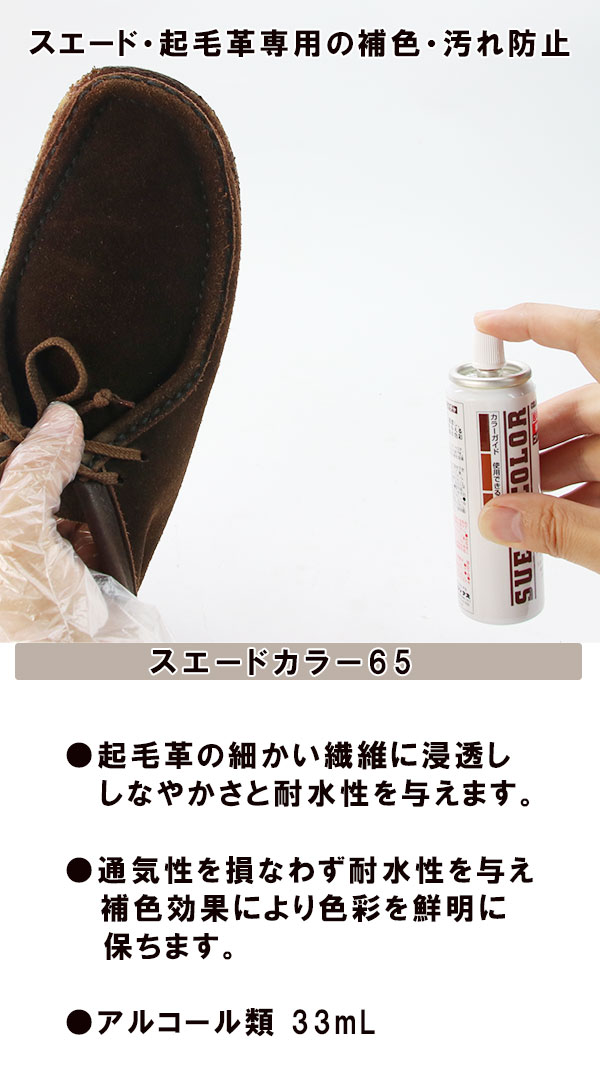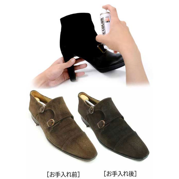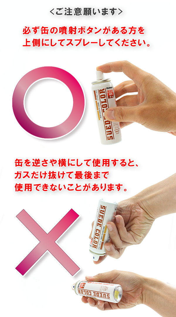 ●コンビ靴のスエード素材以外の部分や飾り、ヒールの裏側等にかからないよう吹きつけてください。