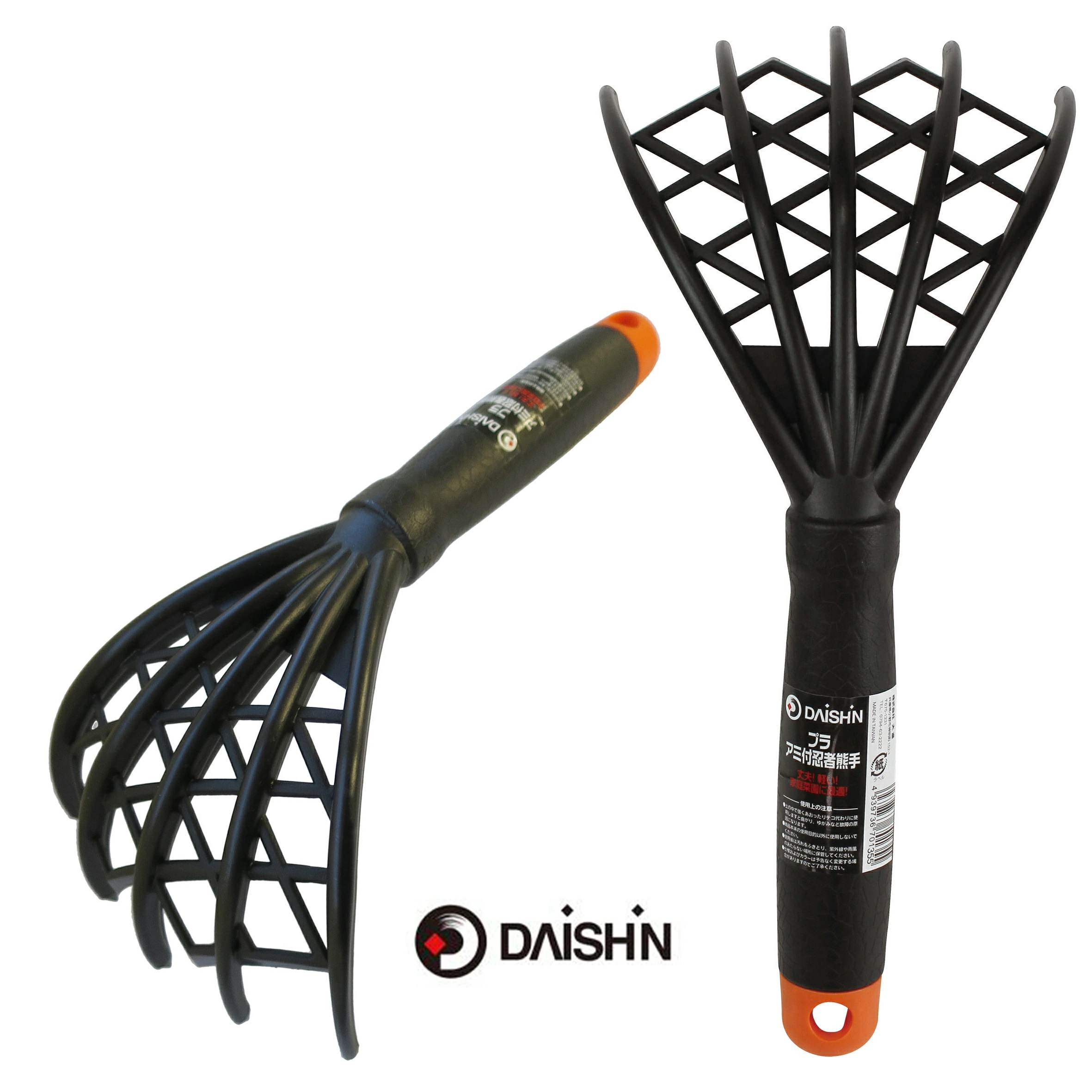 潮干狩りの貝拾いや庭の落ち葉集めが簡単にできる、便利なプラアミ付きの熊手です