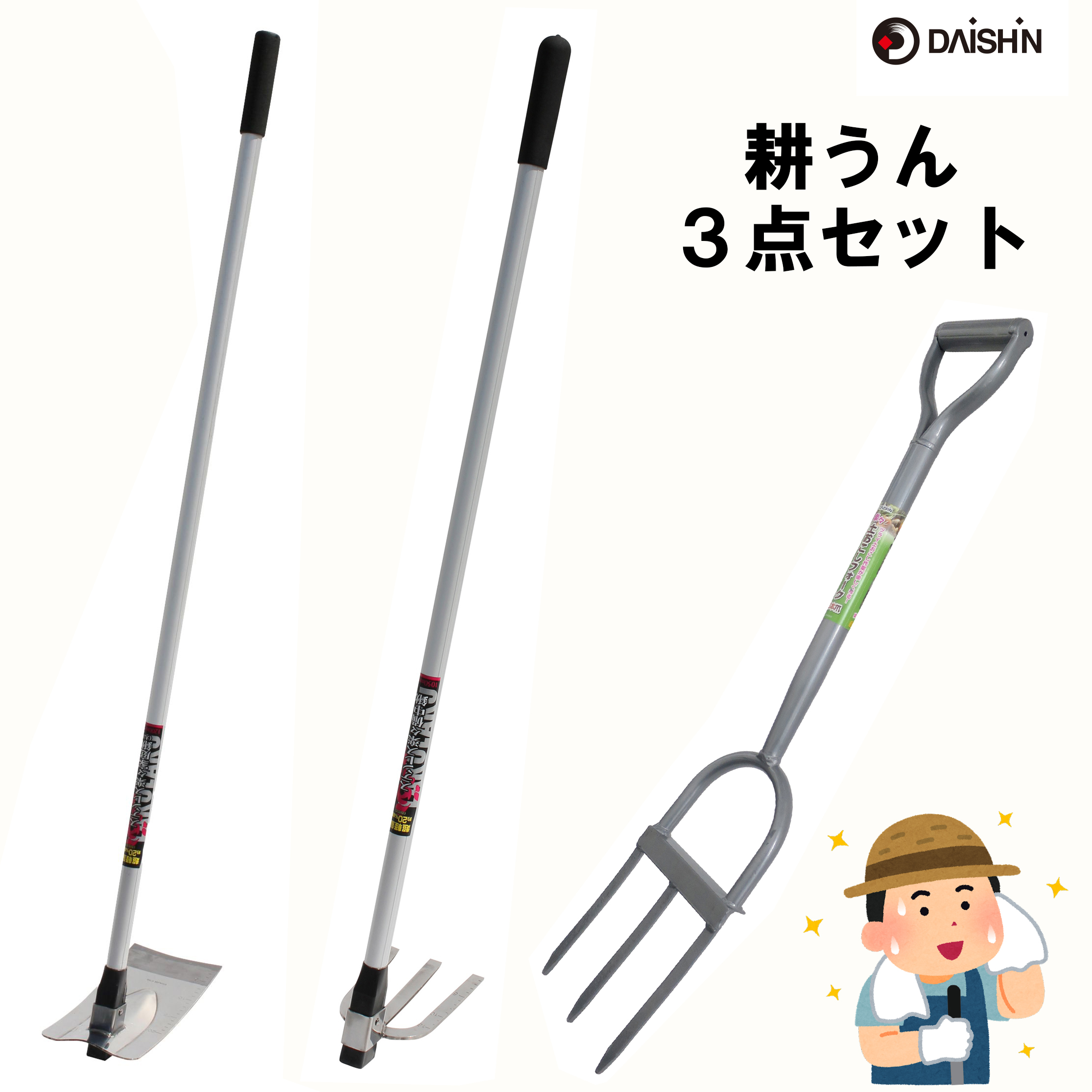 大進 耕うん 3点セット ステンレス楽々備中鍬 と ステンレス楽々家庭鍬 大 と 楽々土起こしフォーク 3本爪 のセット