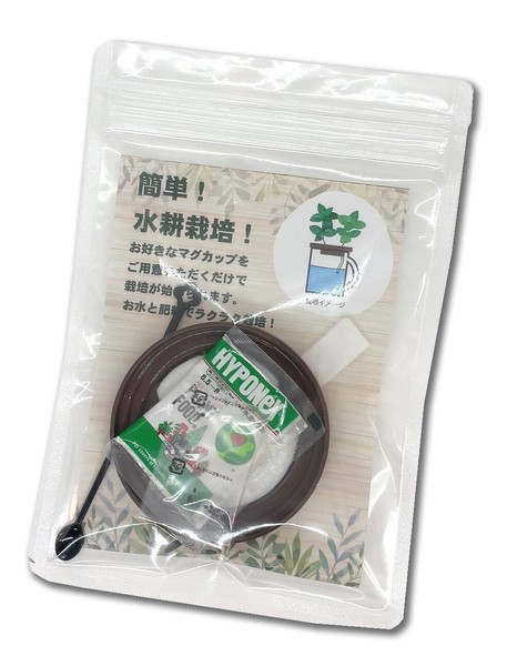 お好きなマグカップをご用意いただくだけで栽培が始められます。お水と肥料でラクラク栽培! ご用意頂くものはマグカップとお水だけ。中に栽培用の蓋、スプーン、微粉肥料、取説 タネが入っています。