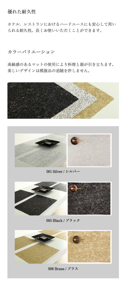 ・ブランド: chilewich(チルウィッチ) ・デザイン: Sandy Chilewich(サンディ チルウィッチ) ・ブランド国:アメリカ | | ■備考 ・素材と製法上、全商品前編に対して±1cmまではサイズの異なりが生じます。 ・鍋敷きとしてのご使用、洗浄機のご使用、アイロンのご使用、製品の裁断等は行わないでください。 ・キッチン用漂白剤ならびにアルコール除菌スプレーは薬剤成分や濃度により脱色の可能性があります。 ・お手入れ方法については、スポンジに中性洗剤を含ませマットを拭いた後、水またはぬるま湯ですすいでください。洗浄後は乾いたクロスで拭き、風通しの良い場所にて水平状態で保管してください。 ・ご覧頂く環境により色や材質の見え方が実際の商品と多少異なることがございます。 |