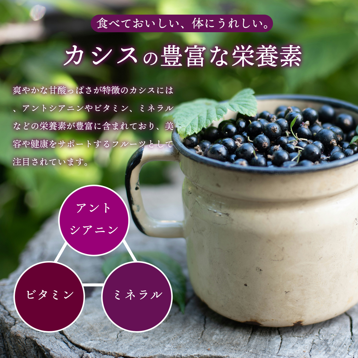 爽やかな甘酸っぱさが特徴のカシスには、アントシアニンやビタミン、ミネラルなどの栄養素が豊富に含まれており、美容や健康をサポートするフルーツとして注目されています。