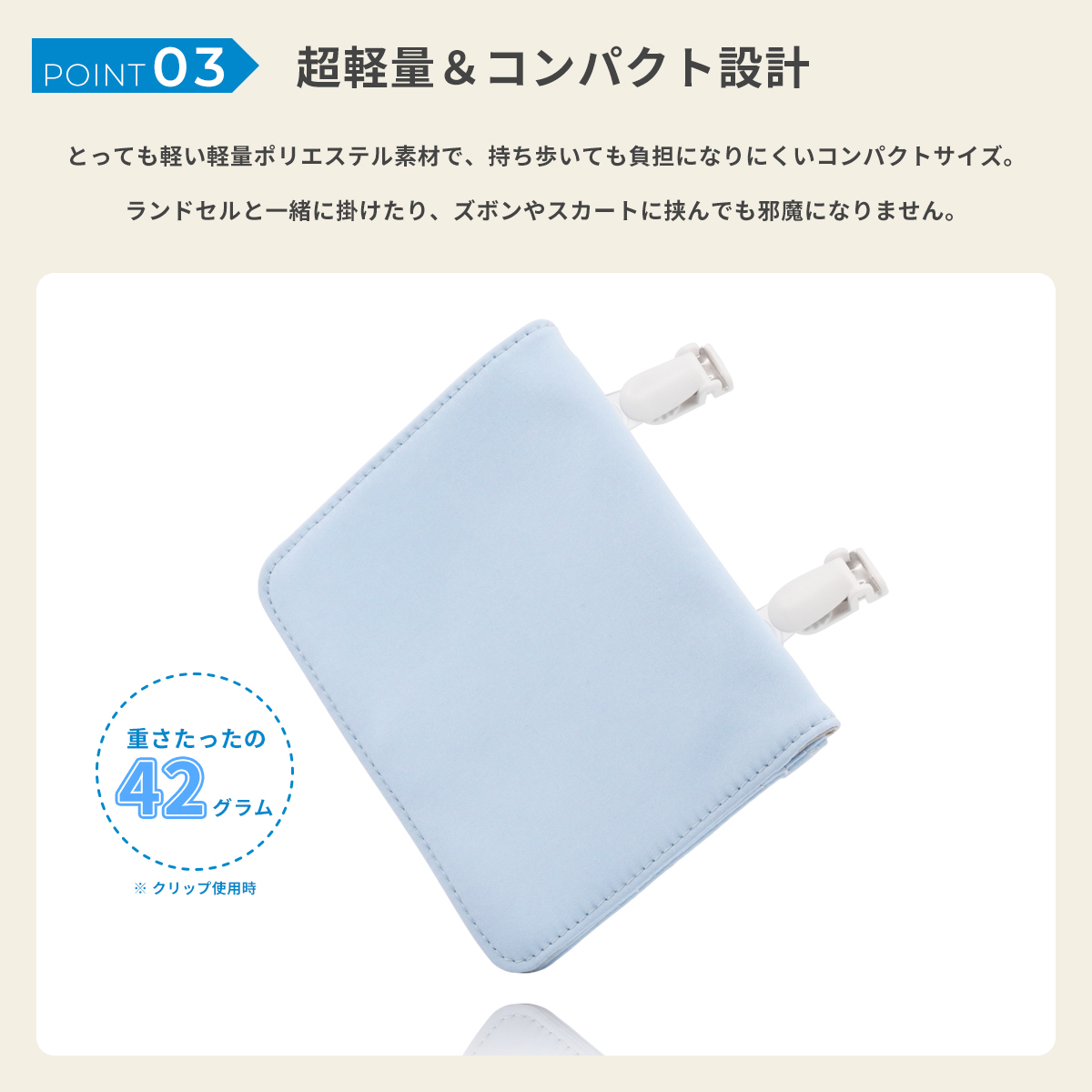 ランドセルと一緒に掛けたり、ズボンやスカートに挟んでも邪魔になりません。
