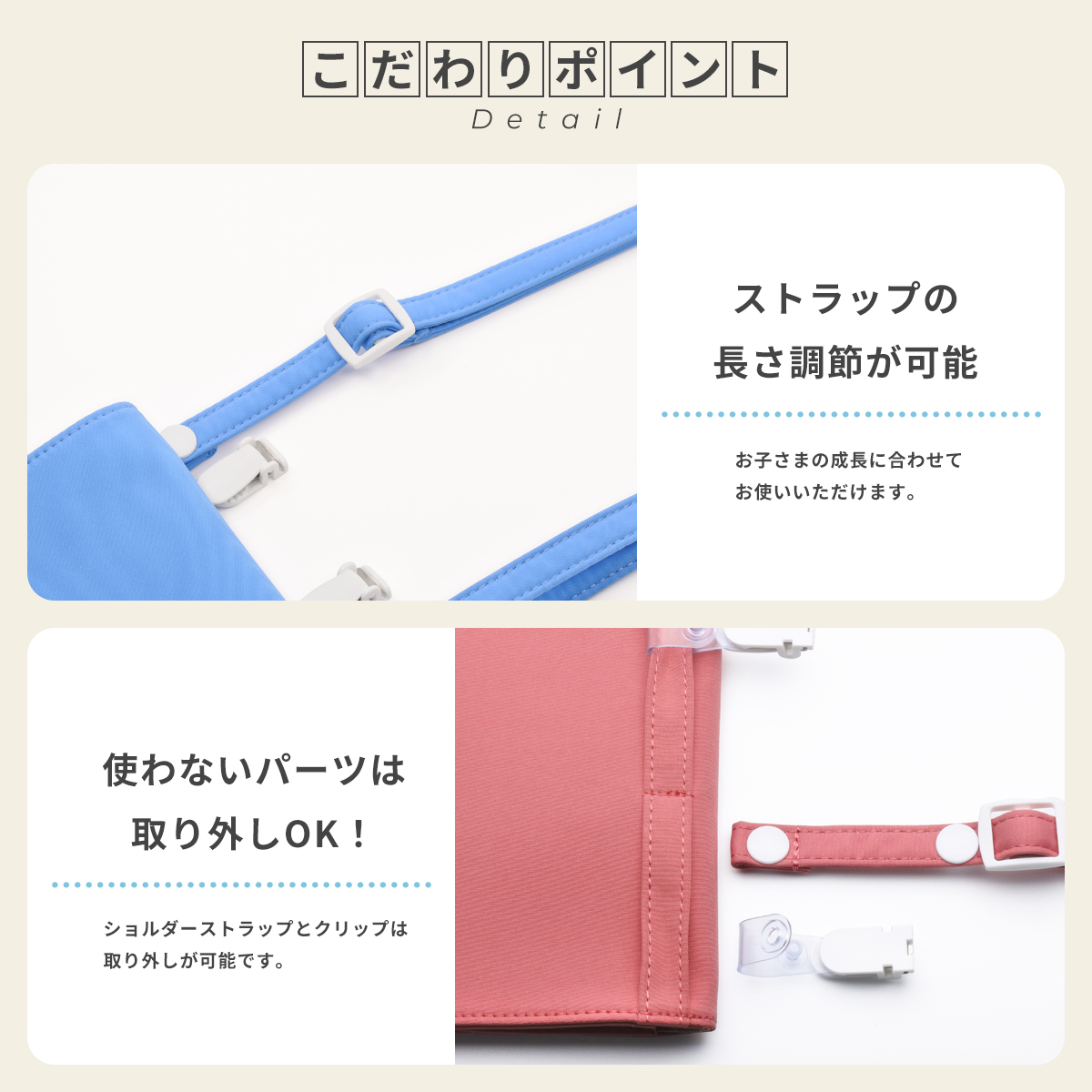 ● こだわりポイント・ストラップの長さ調節が可能。お子さまの成長に合わせてお使いいただけます。