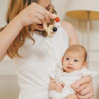 握ったり振ったりの遊びを繰り返しながら細かい運動能力を高め、ビーズのぶつかる心地よい音と木製リングの感触が感覚の発達を促します。