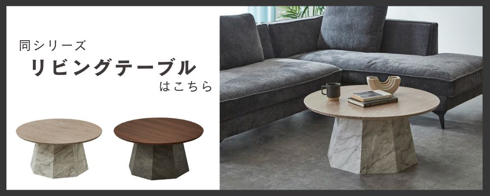 木目調の天板と大理石調の脚の異素材の組み合わせが美しく調和