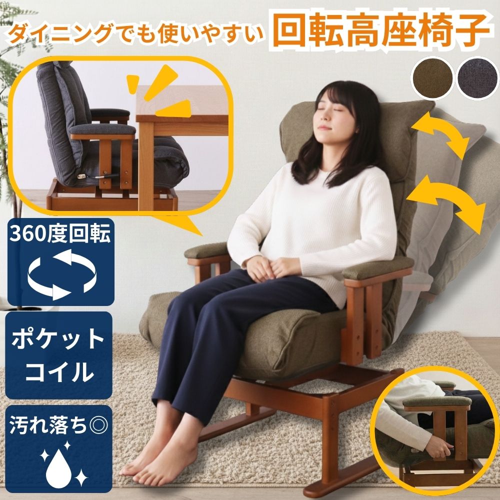 回転式 高座椅子 レバー式 ハイバック ポケットコイル 高齢者 リクライニングチェア 立ち上がりやすい 一人掛け 肘掛け椅子 肘付き 背面折りたたみ バーレル