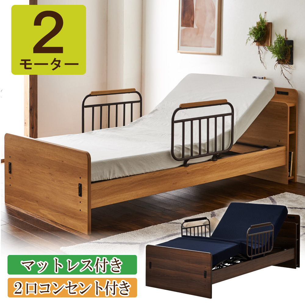 電動ベッド 2モーター 介護ベッド エチュード 家庭用 シングル マットレス付 セット 手すり付 高さ調節 コンセント付 宮付き 棚 リクライニング 組立 玄関渡し