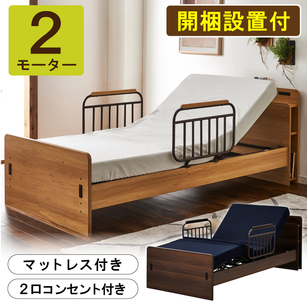 開梱設置付 電動ベッド 2モーター 介護ベッド エチュード 家庭用 シングル マットレス付 セット 手すり付 高さ調節 コンセント付 宮付き 棚 リクライニング 組立
