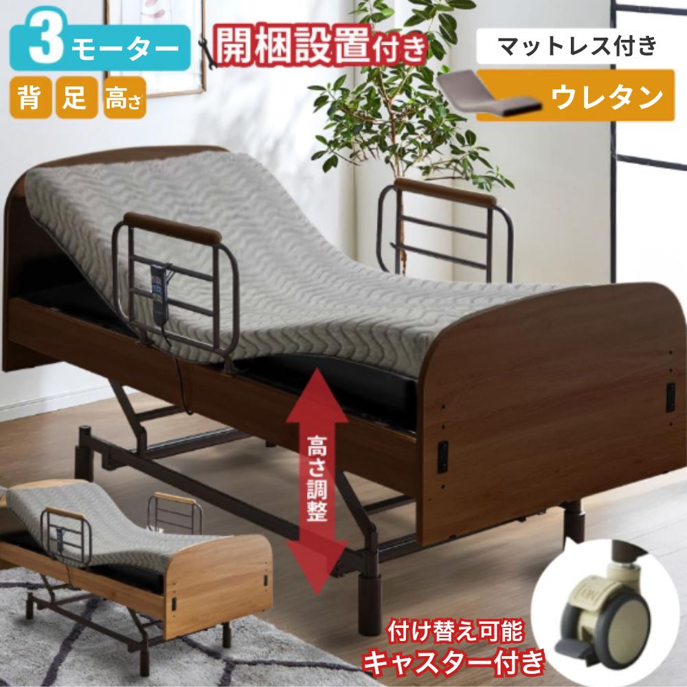 開梱設置付 電動ベッド 3モーター 介護用ベッド キャスター付き リクライニング シングル フレーム+ウレタンマットセット 手すり付 リモコン 高さ調整 ローザン