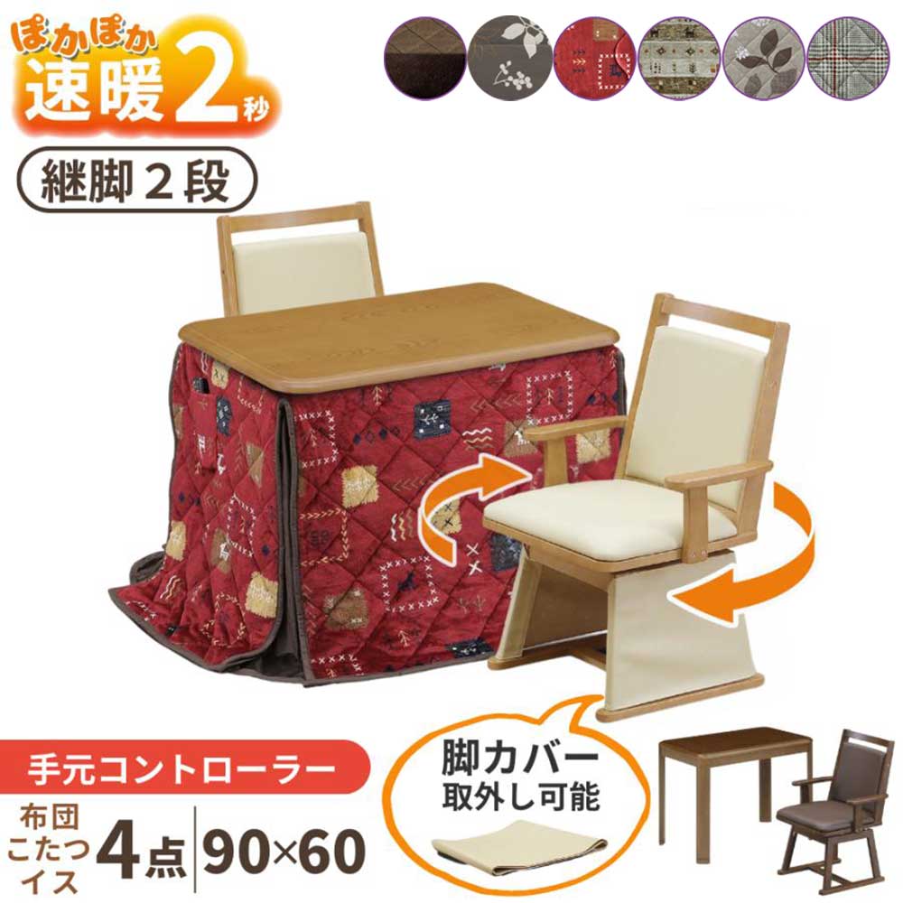 速暖2秒 ダイニングこたつ ハイタイプ 4点セット 2人用 長方形 90×60 UKT-960 UKC-256 2脚 コタツ ハロゲン 肘付き 回転チェア 椅子 イス 撥水 布団 上久