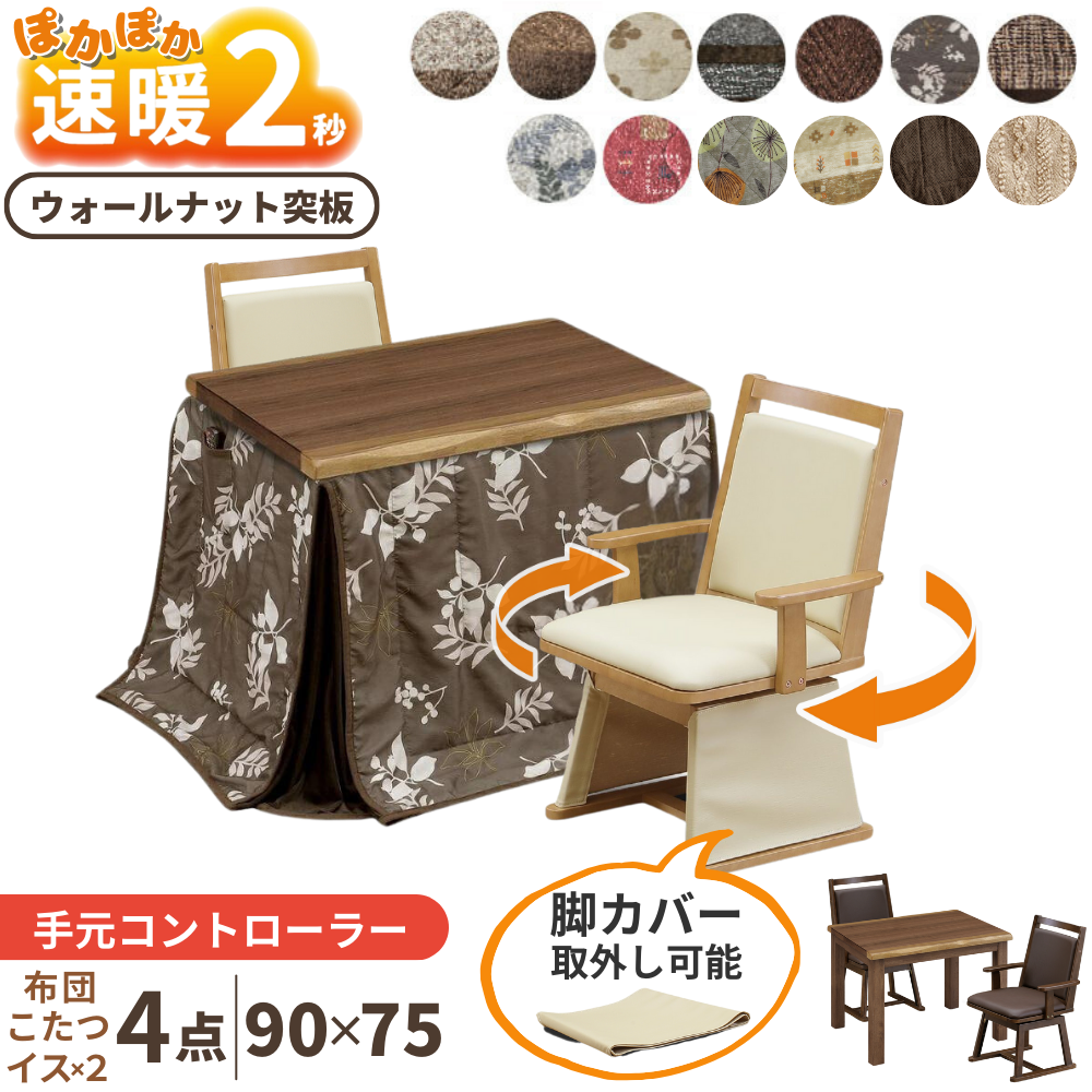 ダイニングこたつ 4点セット ハイタイプ 長方形 90×75 肘付き 回転椅子 2脚 布団 UKT-923 UKC-256 2人用 コタツ ウォールナット オールシーズン おしゃれ